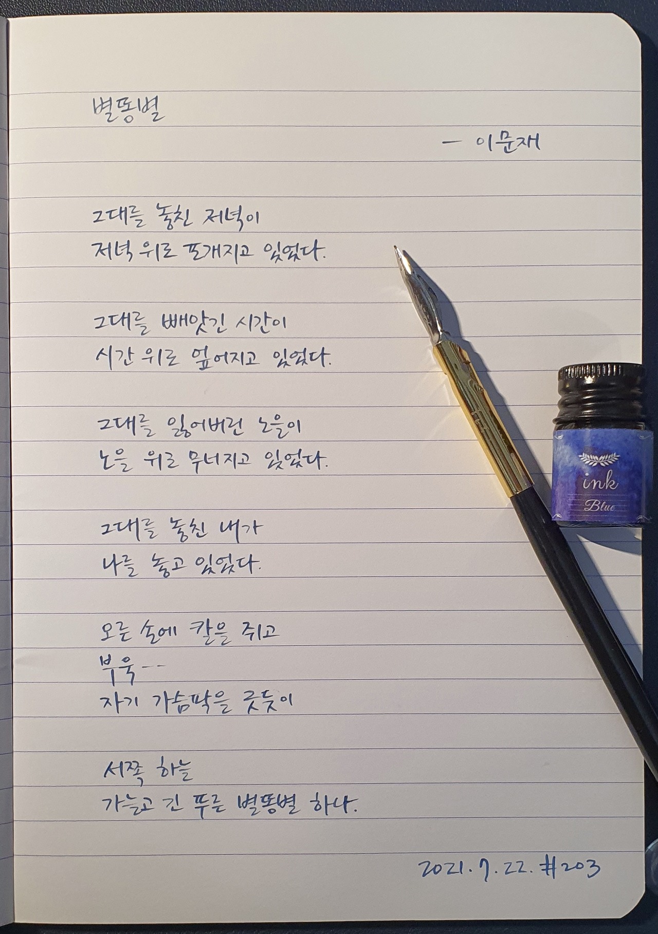 #별똥별 #이문재 #시필사 #닙펜 #딥펜 #펜글씨 #손글씨 #매일시쓰기 #1일1시 #하루에시한편 #이른아침을먹던여름 #thatsummerwithyou