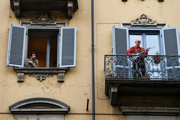 이동금지령 내려진 이탈리아 사람들이 베란다로 나와 노래를 부르고 있다