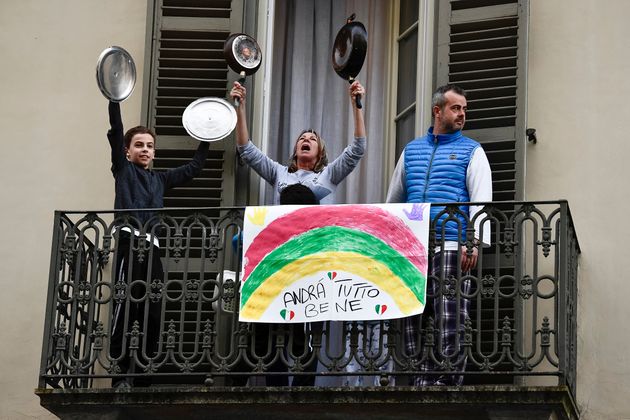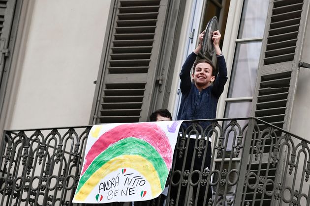NICOLÒ CAMPO VIA GETTY IMAGES한 어린이가 발코니에 나와 냄비 뚜껑으로 연주를 하고 있다. '모든 게 좋아질 거야'라고 적힌 배너가 난간에 걸려있다. 토리노, 이탈리아. 2020년 3월13일.