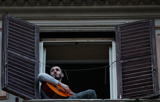 GUGLIELMO MANGIAPANE / REUTERS한 남성이 창틀에 걸터앉아 기타를 연주하고 있다. 로마, 이탈리아. 2020년 3월13일.