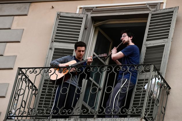 NICOLÒ CAMPO VIA GETTY IMAGES두 남성이 각각 기타와 플룻을 연주하고 있다. 토리노, 이탈리아. 2020년 3월13일.