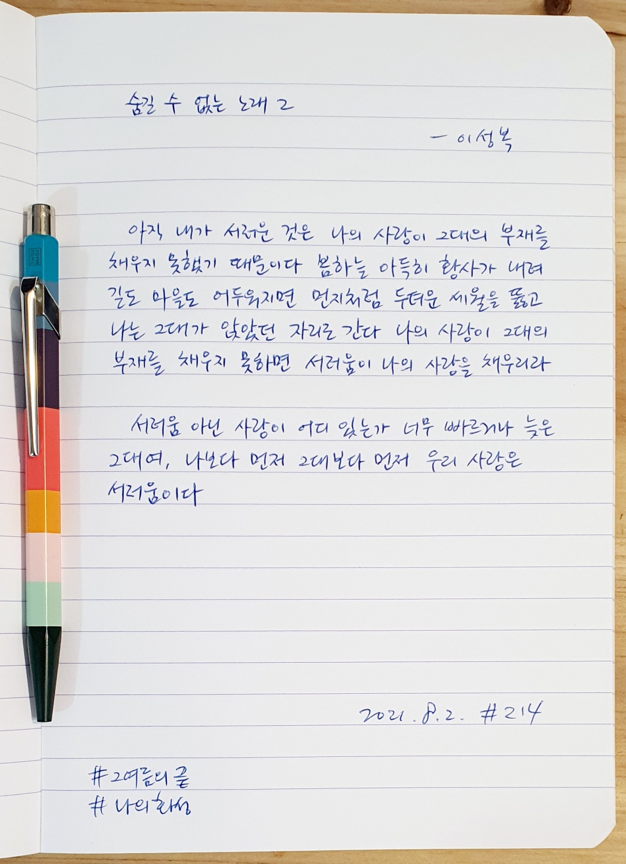 #숨길수없는노래2 #이성복 #시필사 #볼펜 #까렌다쉬 #CaranDache #폴스미스 #PaulSmith #손글씨 #매일시쓰기 #1일1시 #하루에시한편 #이른아침을먹던여름 #thatsummerwithyou #나의화성 #MyMars