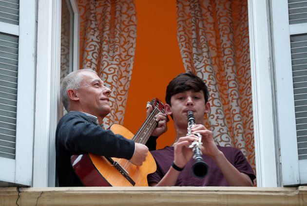 NICOLÒ CAMPO VIA GETTY IMAGES두 남성이 각각 기타와 플룻을 연주하고 있다. 토리노, 이탈리아. 2020년 3월13일.