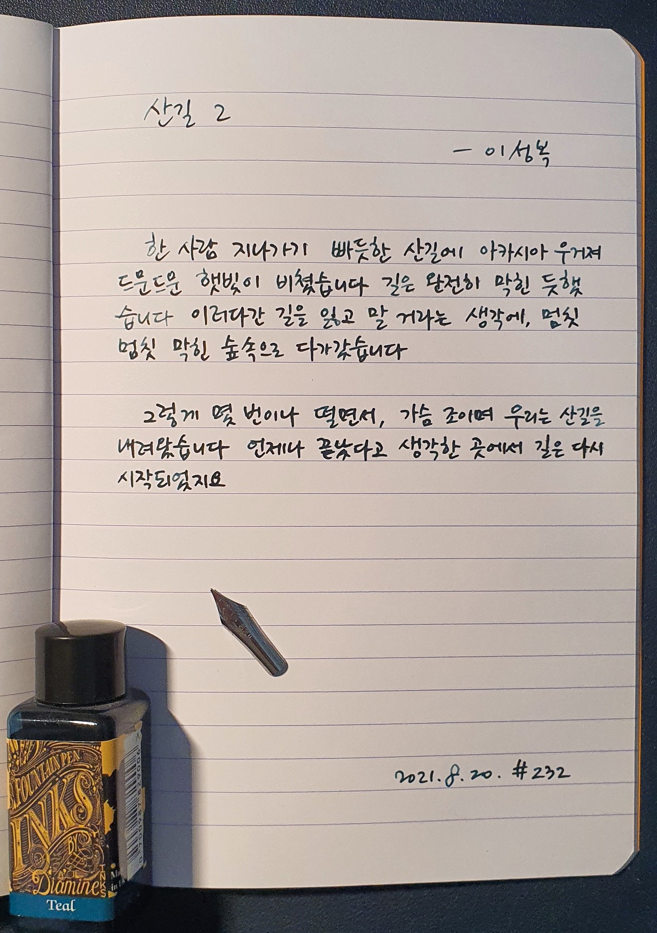 #산길2 #이성복 #시필사 #닙펜 #딥펜 #펜글씨 #손글씨 #매일시쓰기 #1일1시 #하루에시한편 #이른아침을먹던여름 #thatsummerwithyou