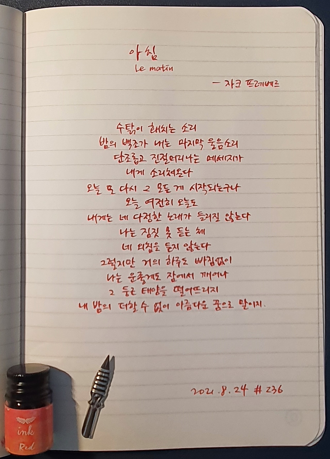 #아침 #자크프레베르 #쟈끄프레베르 #JacquesPrevert #시필사 #닙펜 #딥펜 #펜글씨 #손글씨 #매일시쓰기 #1일1시 #하루에시한편 #이른아침을먹던여름 #thatsummerwithyou