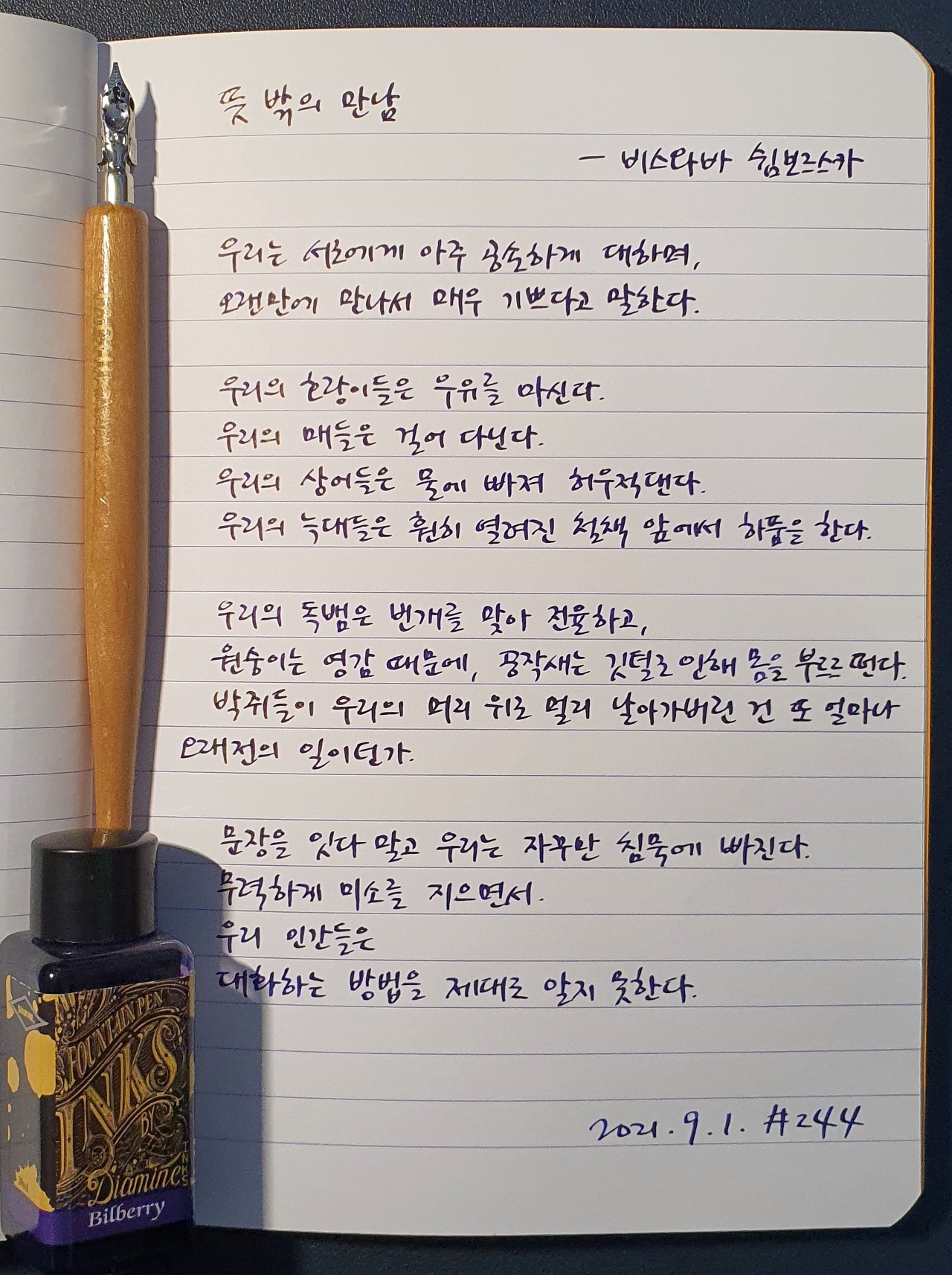 #뜻밖의만남 #비스와바쉼보르스카 #시필사 #닙펜 #딥펜 #펜글씨 #손글씨 #매일시쓰기 #1일1시 #하루에시한편 #이른아침을먹던여름 #thatsummerwithyou