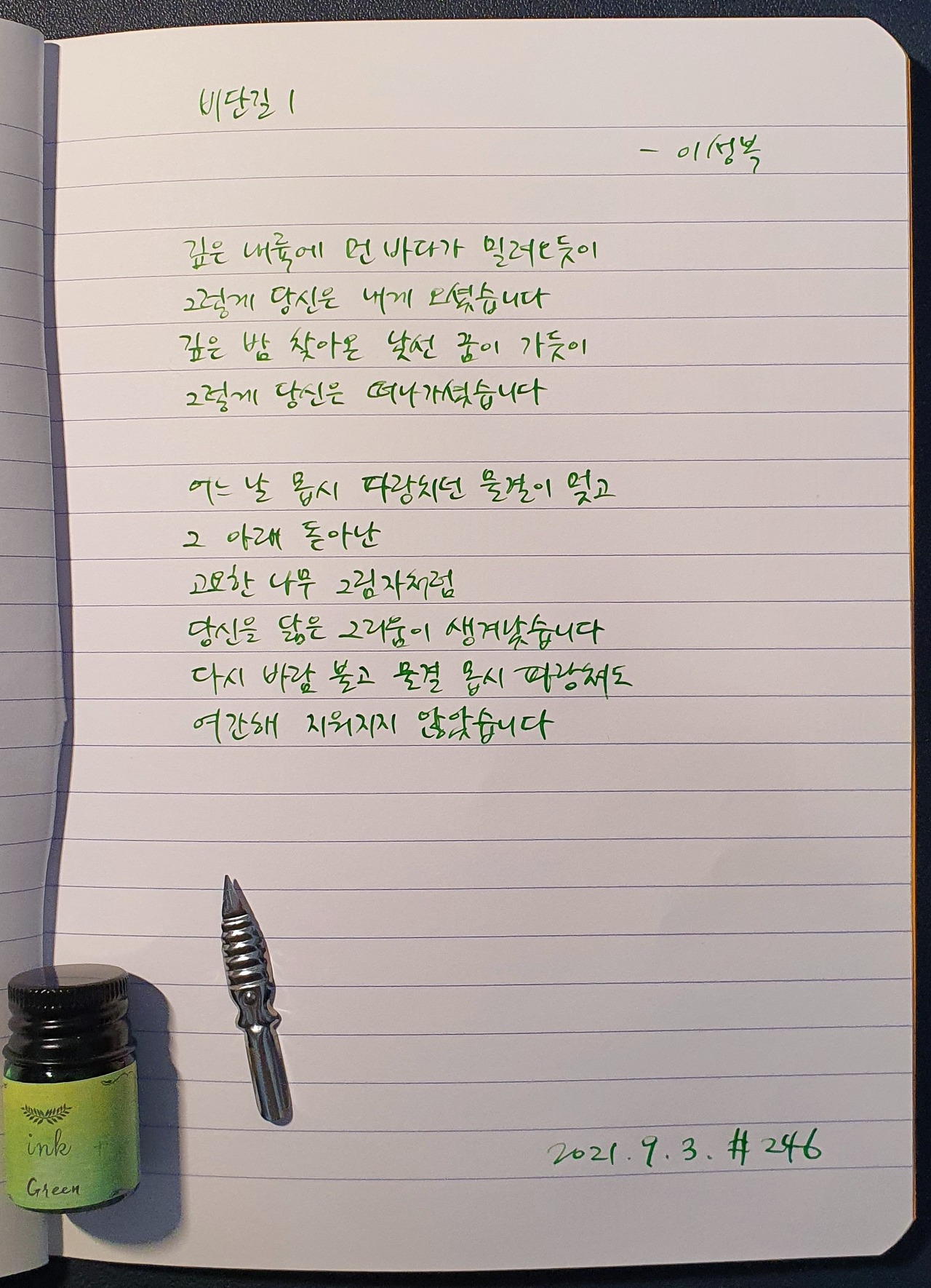 #비단길1 #이성복 #시필사 #닙펜 #딥펜 #펜글씨 #손글씨 #매일시쓰기 #1일1시 #하루에시한편 #이른아침을먹던여름 #thatsummerwithyou