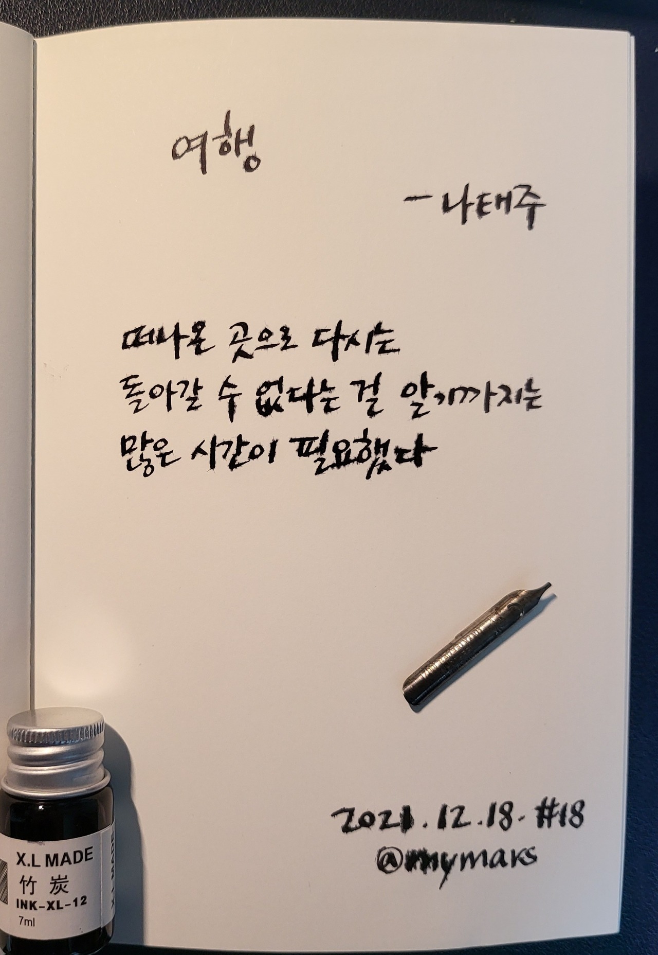 [2021 시필사. 5일 차] 여행 - 나태주 떠나온 곳으로 다시는 돌아갈 수 없다는 걸 알기까지는 많은 시간이 필요했다. #여행 #나태주 #시필사 #닙펜 #딥펜 #펜글씨 #손글씨 #매일시쓰기 #1일1시 #하루