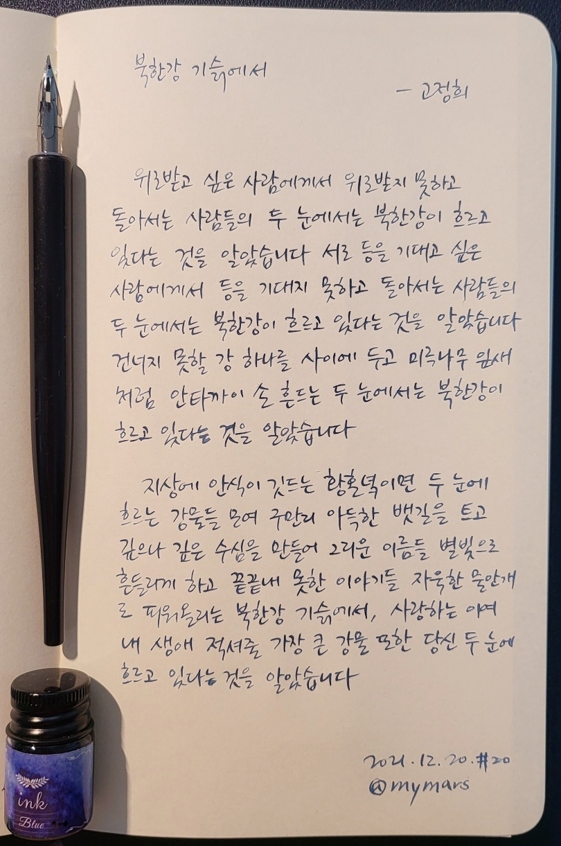 #북한강기슭에서 #고정희 #아름다운사람하나 #너에게들려주는시 #poetrytoyou #시 #시낭독 #시낭송 #낭독일기 #시필사 #손글씨 #닙펜 #딥펜 #펜글씨 #매일시쓰기 #1일1시 #하루시한편 #매일프로젝트 #유캔두 #일단백챌린지 #카카오임펙트 #프로젝트100 #마이마르스 #mymars #나의화성