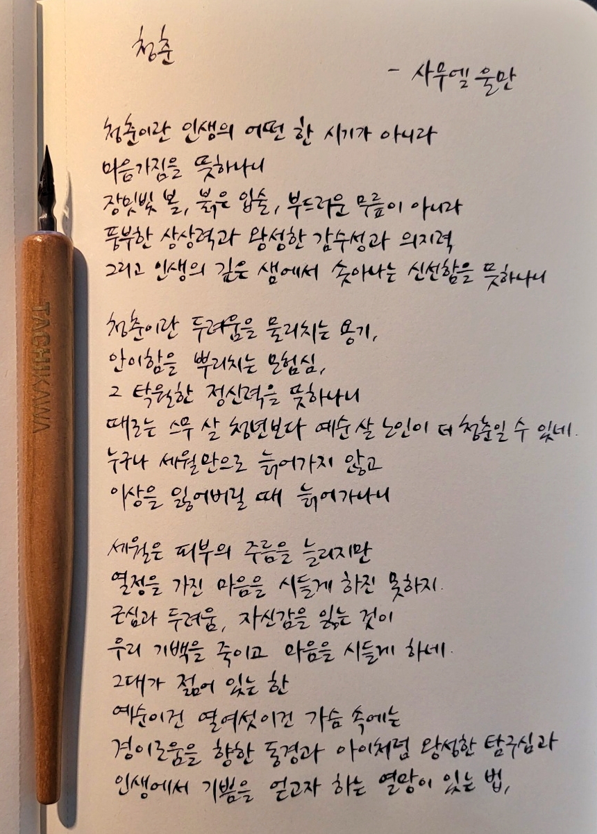 #청춘 #사무엘울만 #Youth #너에게들려주는시 #poetrytoyou #시 #시낭독 #시낭송 #낭독일기 #시필사 #손글씨 #닙펜 #딥펜 #펜글씨 #매일시쓰기 #1일1시 #하루시한편 #매일프로젝트 #유캔두 #일단백챌린지 #카카오임펙트 #프로젝트100 #마이마르스 #mymars #나의화성
