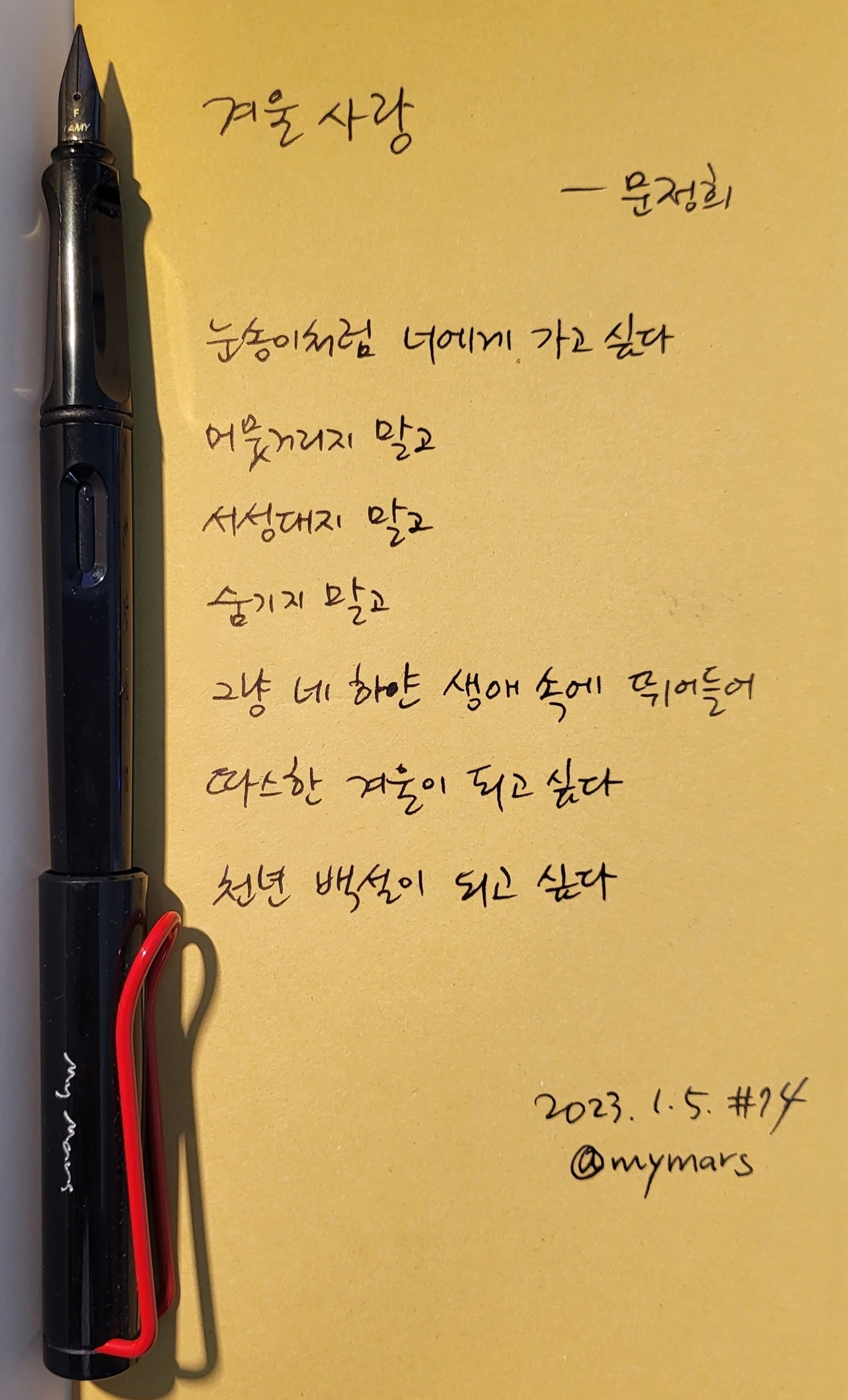 #겨울사랑 #문정희 #한계령을위한연가 #너에게들려주는시 #poetrytoyou #시 #시낭독 #시낭송 #낭독일기 #시필사 #손글씨 #펜글씨 #만년필 #LAMI #마이마르스 #나의화성 #mymars