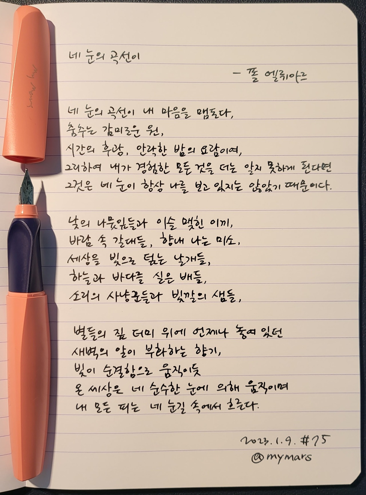 #네눈의곡선이 #폴엘뤼아르 #PaulEluard #너에게들려주는시 #poetrytoyou #시 #시낭독 #시낭송 #낭독일기 #시필사 #손글씨 #닙펜 #딥펜 #펜글씨 #마이마르스 #mymars #나의화성