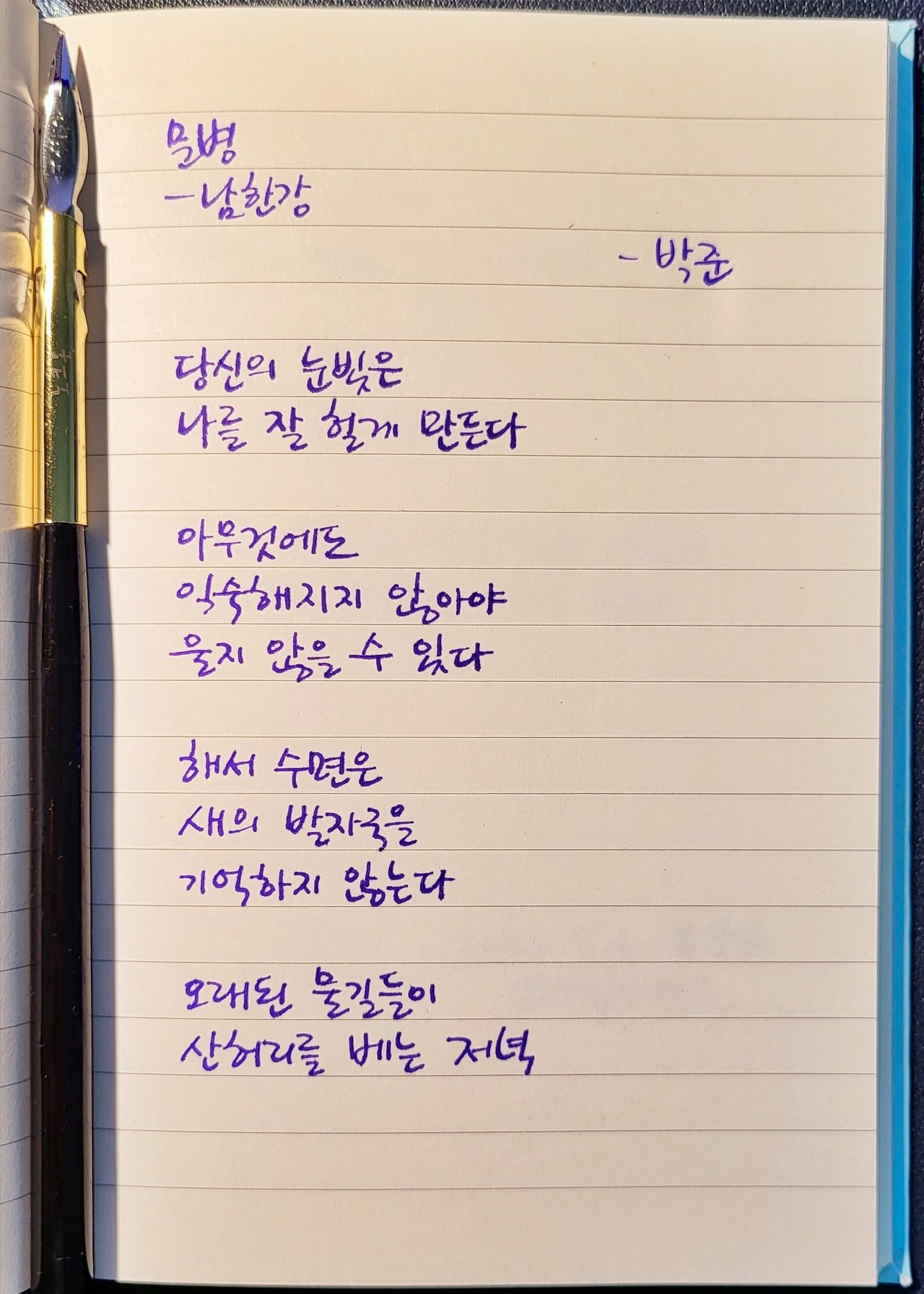 #문병 #남한강 #박준 #당신의이름을지어다가며칠은먹었다 #너에게들려주는시 #poetrytoyou #시 #시낭독 #시낭송 #낭독일기 #시필사 #손글씨 #닙펜 #딥펜 #펜글씨 #마이마르스 #mymars #나의화성