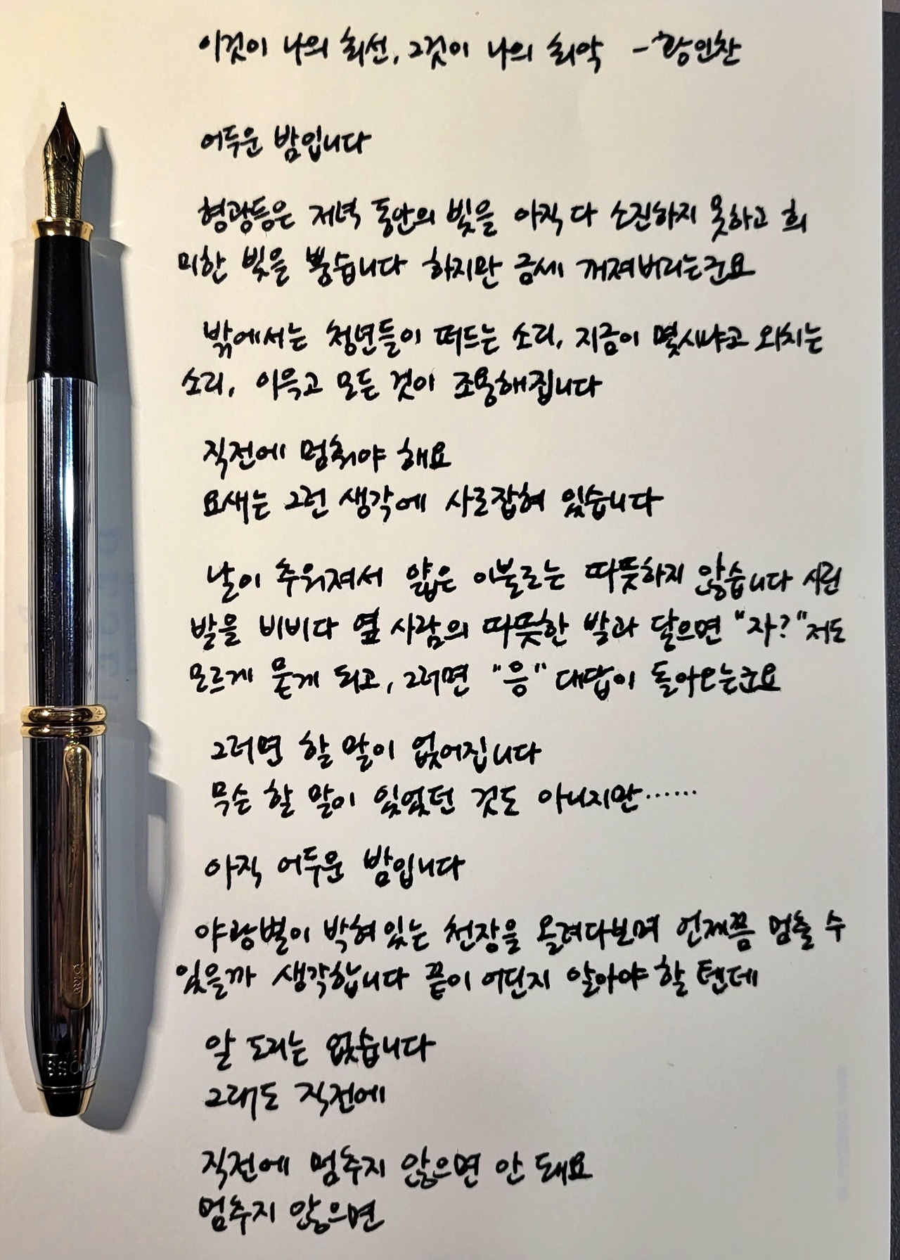 #이것이나의최선그것이나의최악 #황인찬 #사랑을위한되풀이 #너에게들려주는시 #poetrytoyou #시 #시낭독 #시낭송 #낭독일기 #시필사 #손글씨 #펜글씨 #만년필 #마이마르스 #나의화성 #mymars