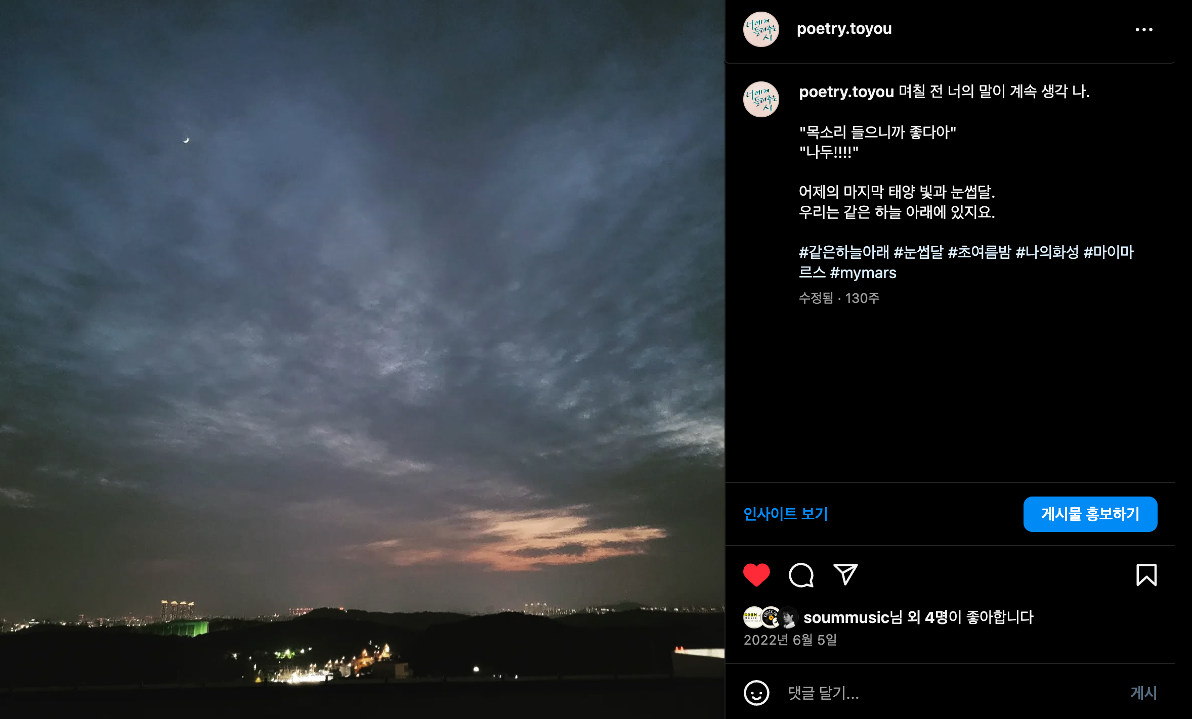 어제의 마지막 태양 빛과 눈썹달.