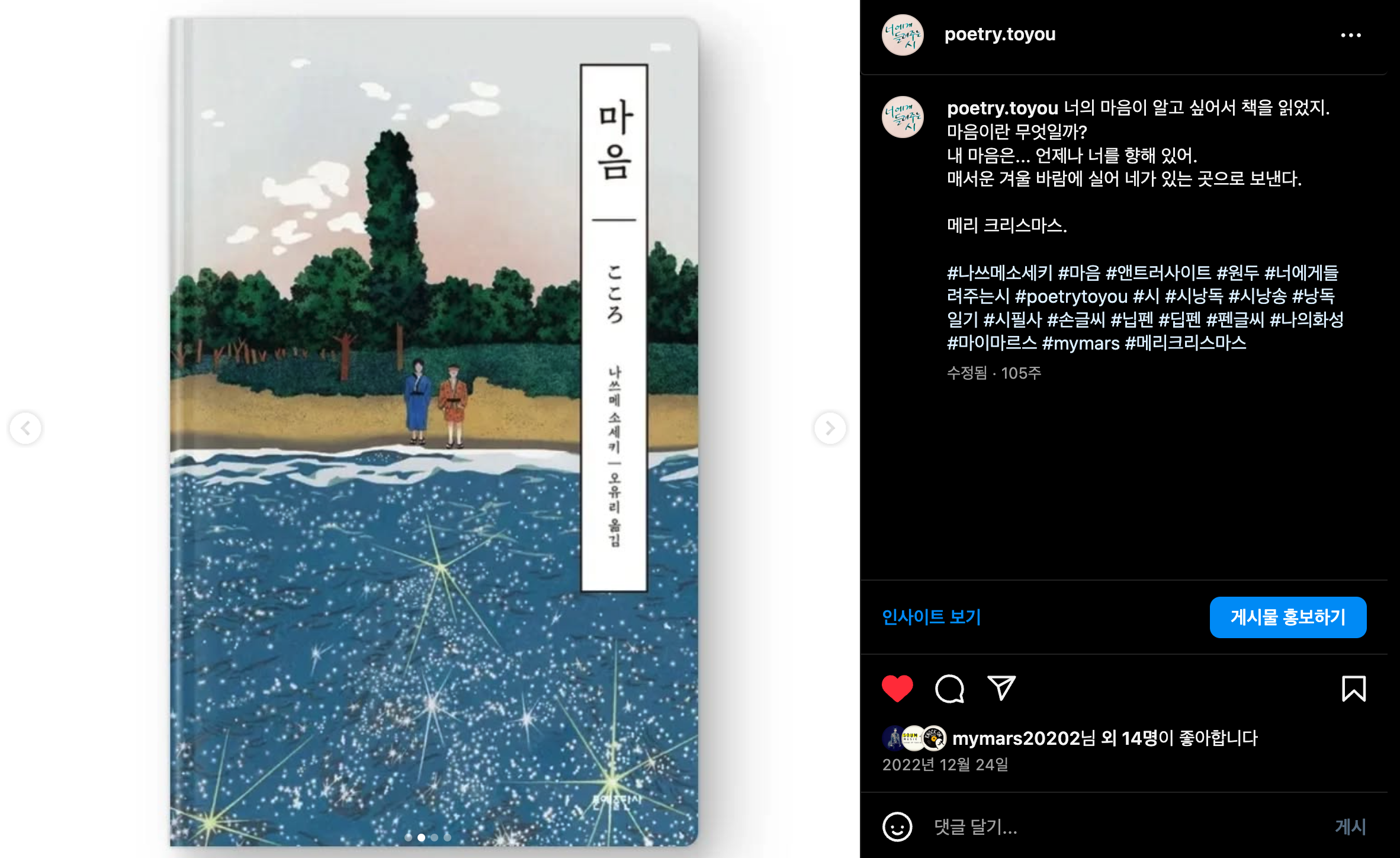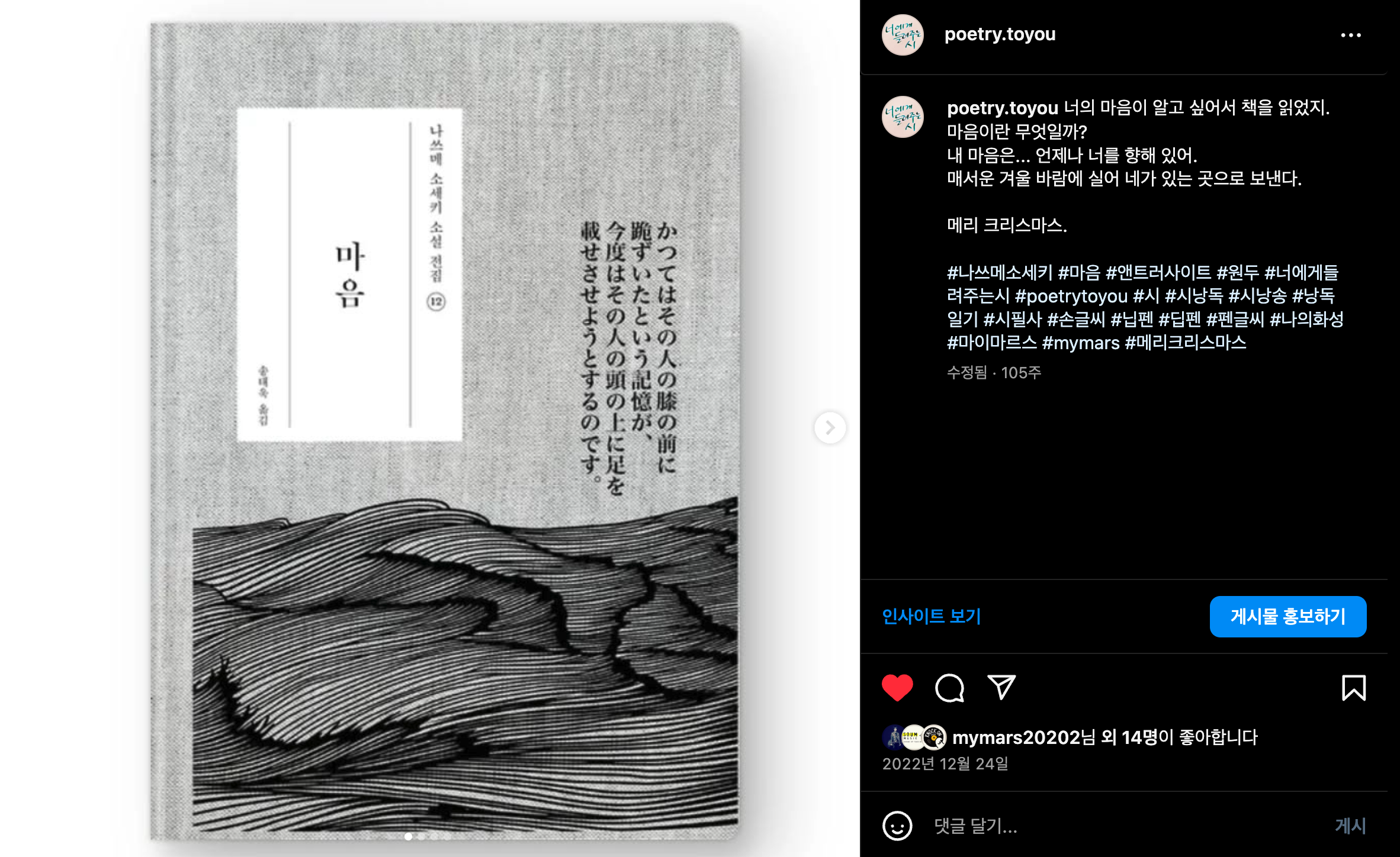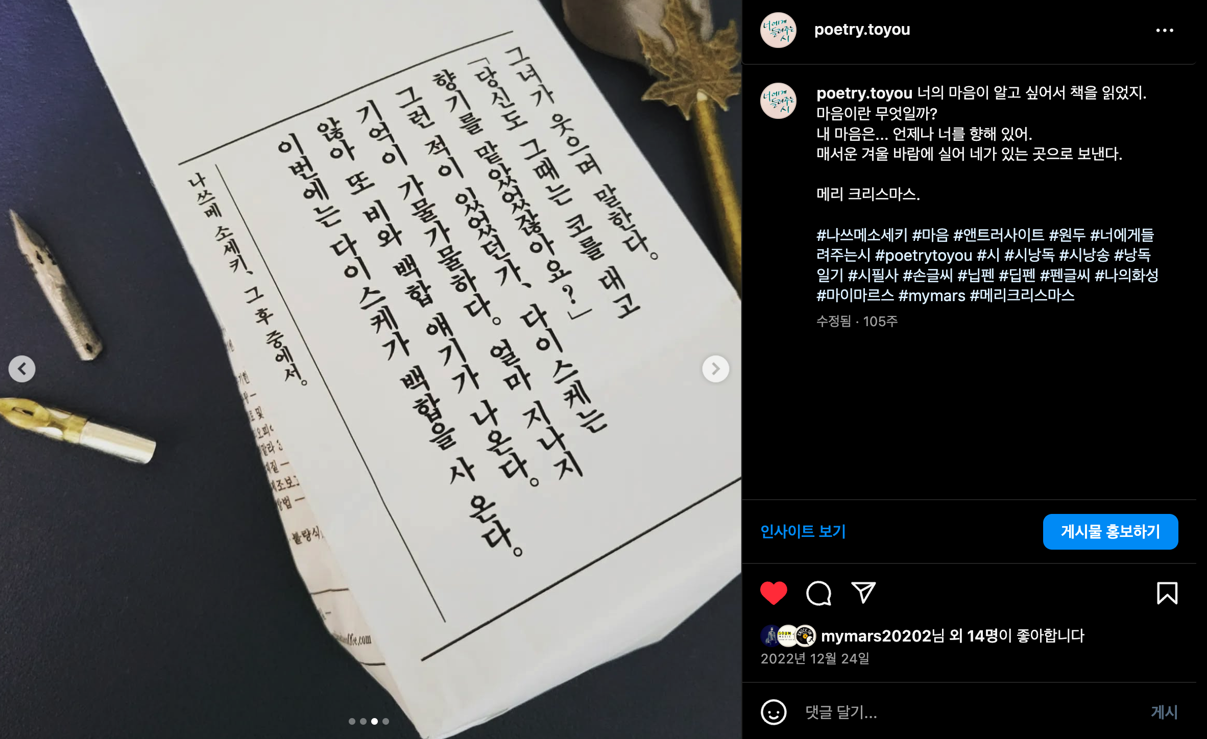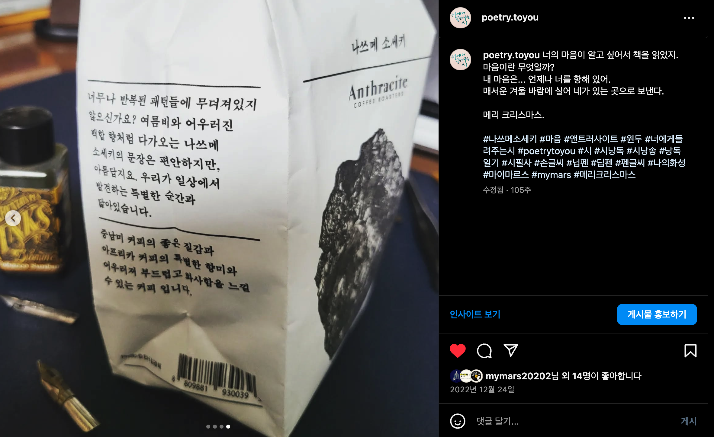 #나쓰메소세키 #마음 #앤트러사이트 #원두 #너에게들려주는시 #poetrytoyou #시 #시낭독 #시낭송 #낭독일기 #시필사 #손글씨 #닙펜 #딥펜 #펜글씨 #나의화성 #마이마르스 #mymars #메리크리스마스