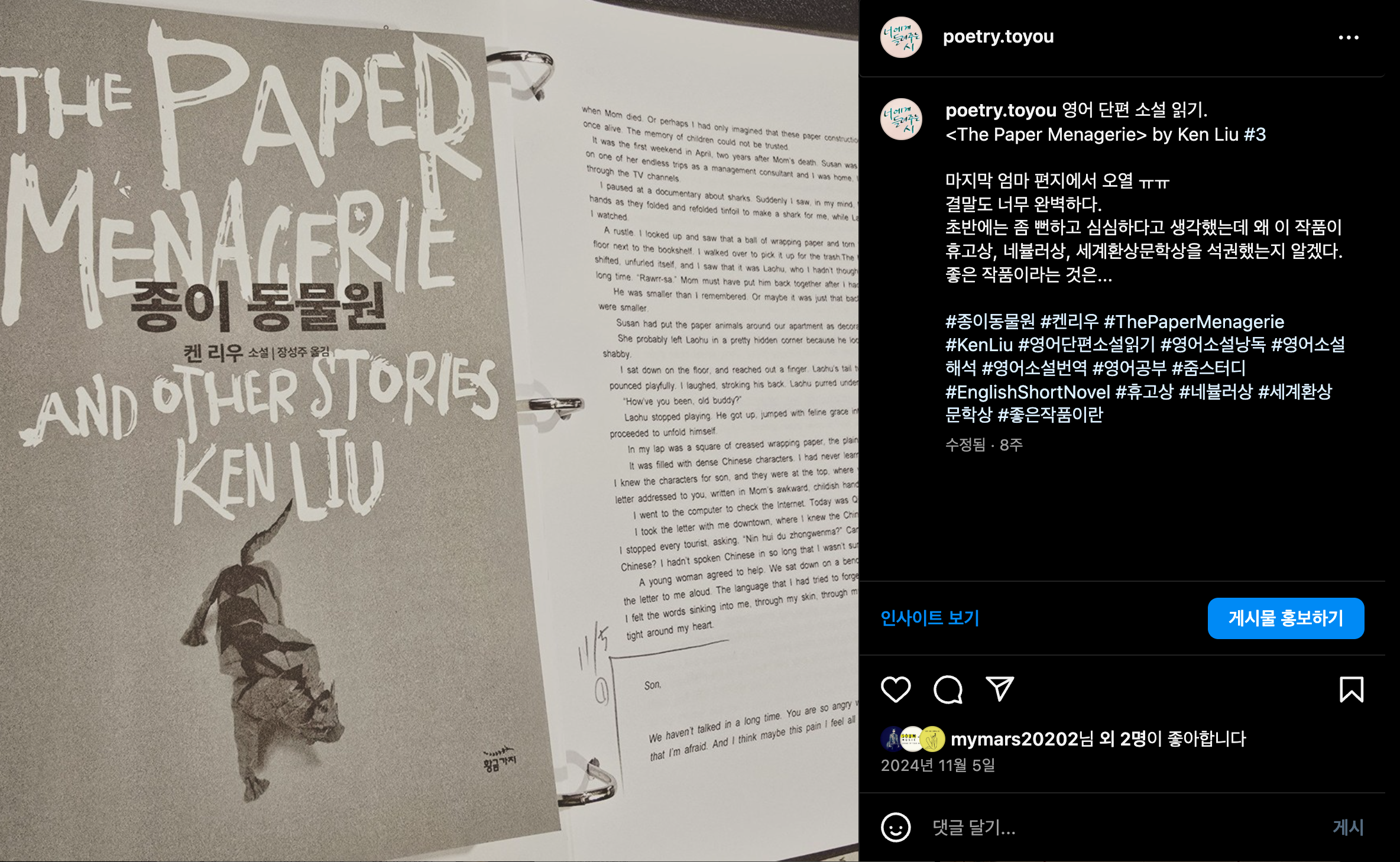 #종이동물원 #켄리우 #ThePaperMenagerie #KenLiu #영어단편소설읽기 #영어소설낭독 #영어소설해석 #영어소설번역 #영어공부 #줌스터디 #EnglishShortNovel #휴고상 #네뷸러상 #세계환상문학상 #좋은작품이란