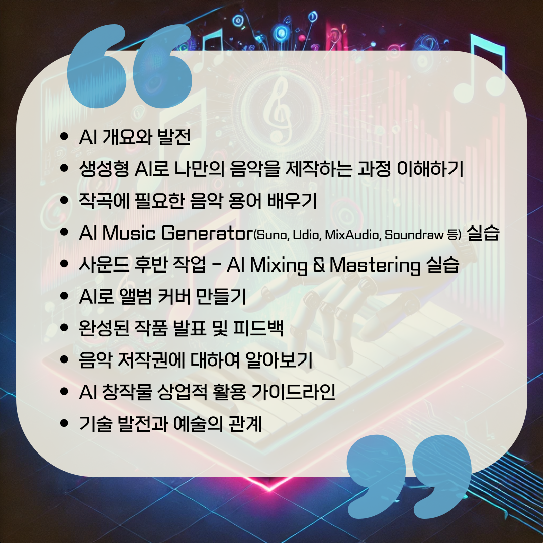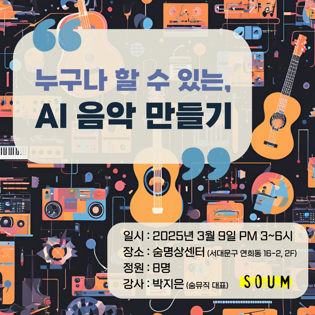 #AI음악만들기 #AI음악창작 #생성형AI #AI작곡 #AI작사 #AI음악 #AI사운드 #AI창작 #AI믹싱 #AI마스터링 #AI앨범커버 #AI워크숍 #AI특강 #AImusic #AIMusicGenerator #Suno #Udio #MixAudio #Soundraw #AIMixing #AIMastering #음악저작권 #강사박지은 #음악과기술 #미래음악 #숨명상센터 #숨뮤직 #노크온레코드 #마이마르스 #mymars