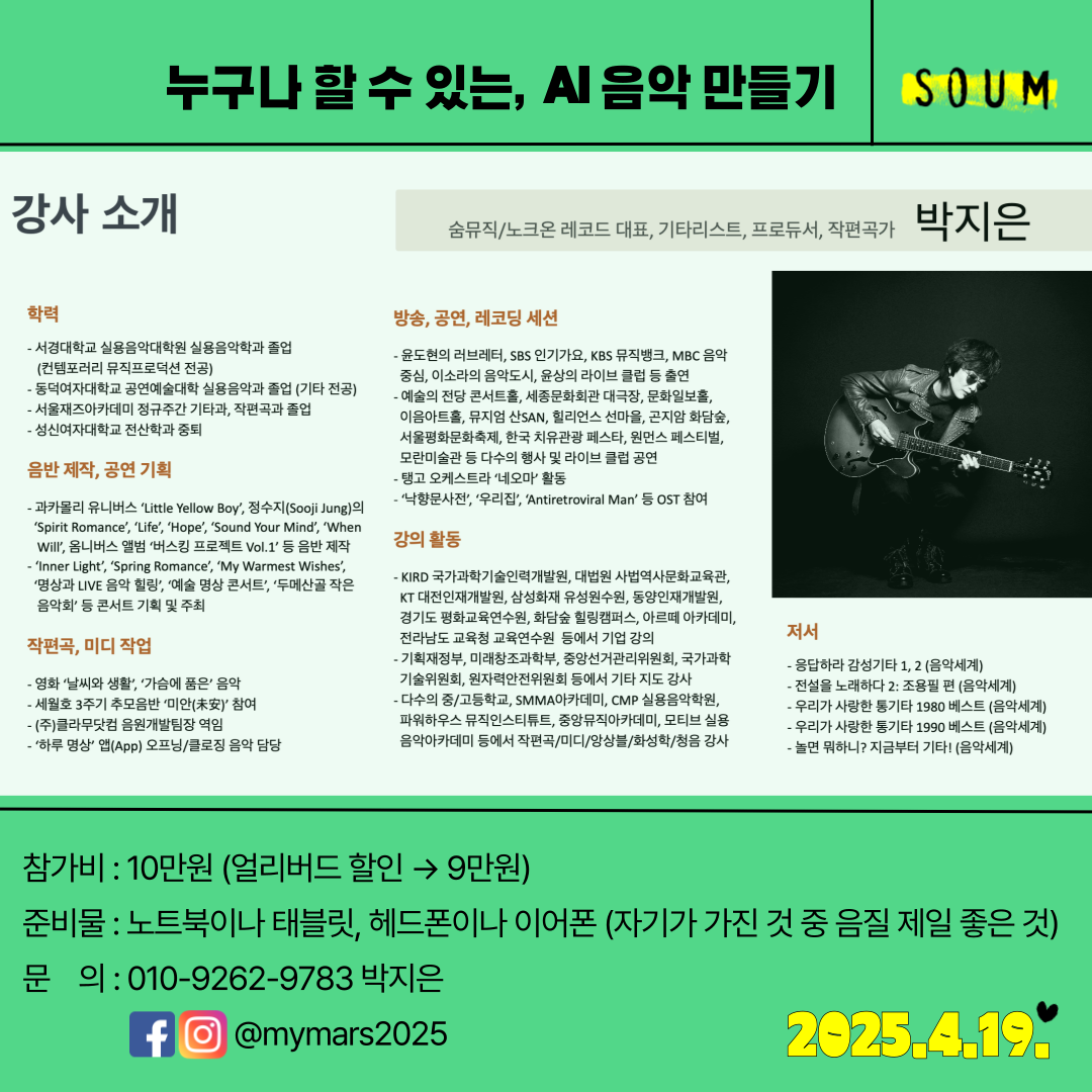 #AI음악만들기 #AI음악창작 #AI작곡 #AI작사 #AI음악 #AI송라이팅 #AI사운드 #AI창작 #인공지능음악 #AI워크숍 #AI특강 #AI강의 #AImusic #음악저작권 #강사박지은 #숨명상센터 #숨뮤직 #노크온레코드 #마이마르스 #mymars