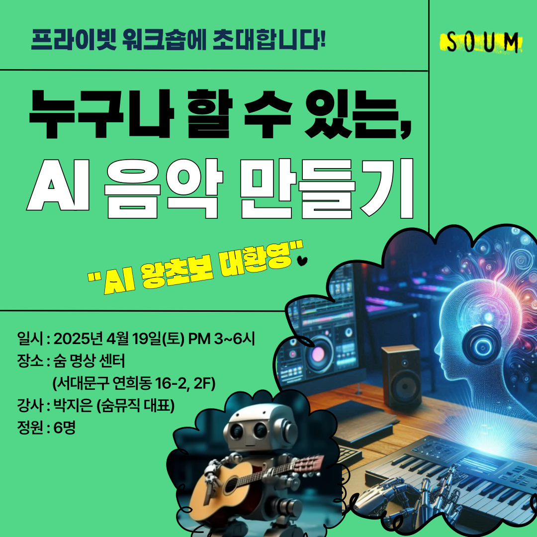 | 누구나 할 수 있는, AI 음악 만들기 : 프라이빗 워크숍 (3) | 2025.03.15 |