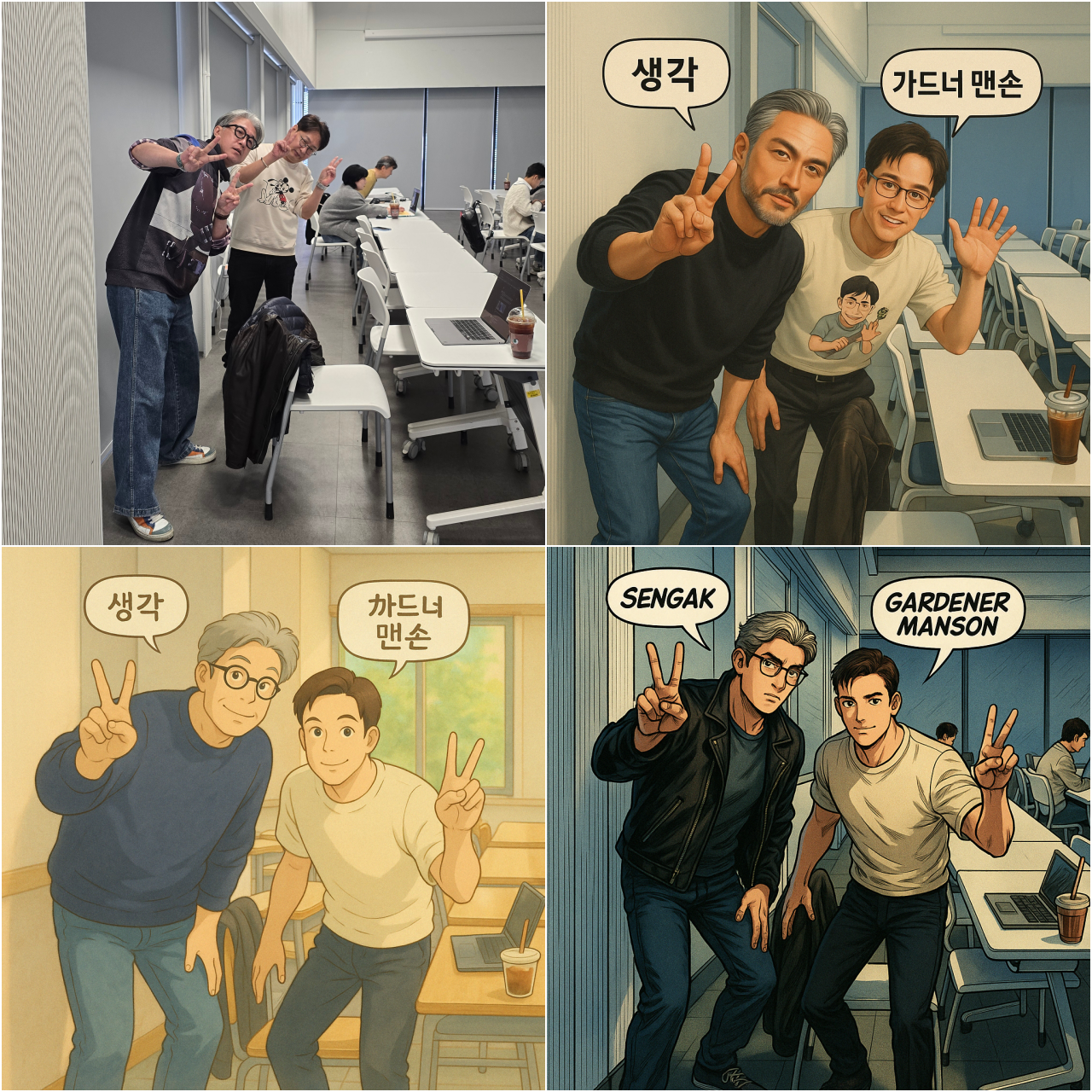 - 우상> 이 사진을 영화배우처럼 그려줄래? 프롬의 매니저이신 '생각'님(왼쪽)과 '가드너 맨손'님(오른쪽)이야. 각각의 이름을 말풍선으로 넣고 배경은 똑같이 하고 정사각형 사이즈로.