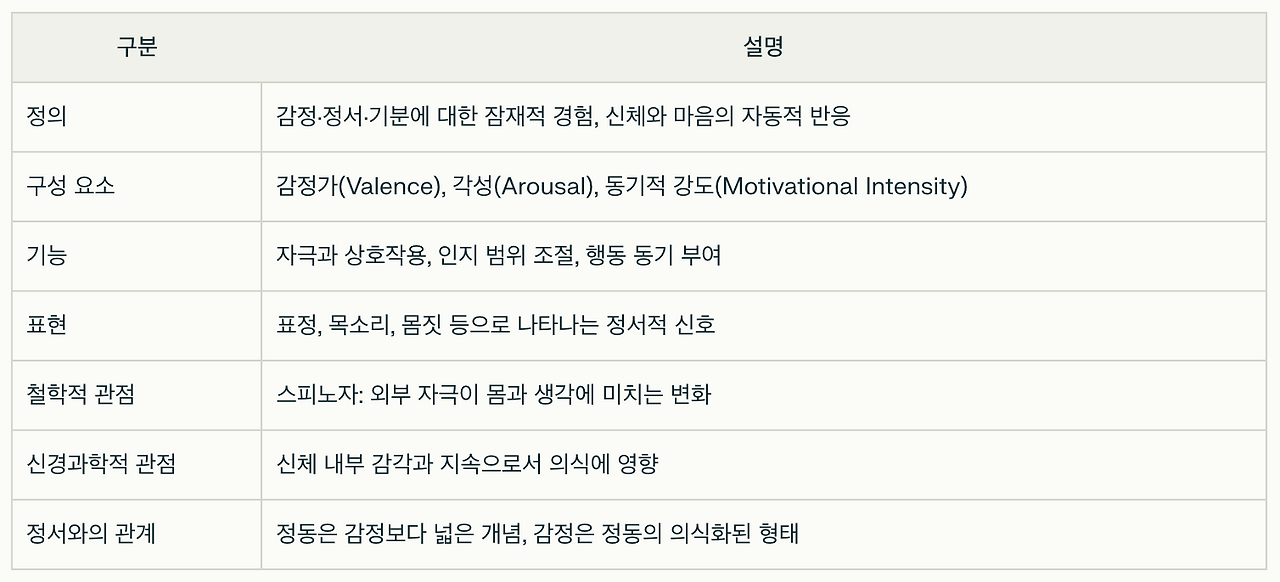 정동은 단순한 감정이나 기분이 아니라 신체와 정신의 복합적이고 역동적인 상태이며, 개인의 내면뿐 아니라 사회적 관계, 문화적 맥락 안에서도 결정적인 역할을 한다.