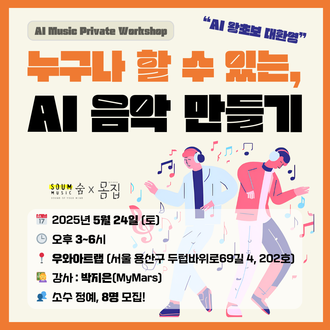 힐링음악 전문 레이블 '숨SOUM뮤직'과 웰니스 콘텐츠 개발 기업 '몸집(MOMZIP)'이 공동 주최하는 이번 행사는 AI 음악 교육의 선구자 '박지은' 강사가 진행을 맡아 화제를 모으고 있다.