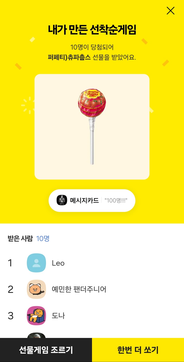 선착순 10명에게, 감사의 마음을 담은 막대사탕을 선물로 드리는 깜짝 선착순 게임이었죠.