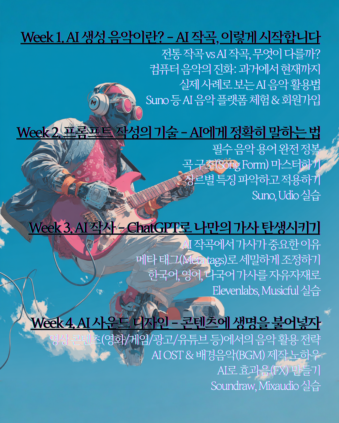 | [누구나 할 수 있는, AI 음악 만들기] 실시간 온라인 강의 '심화반' 오픈! (0) | 2025.10.24 |