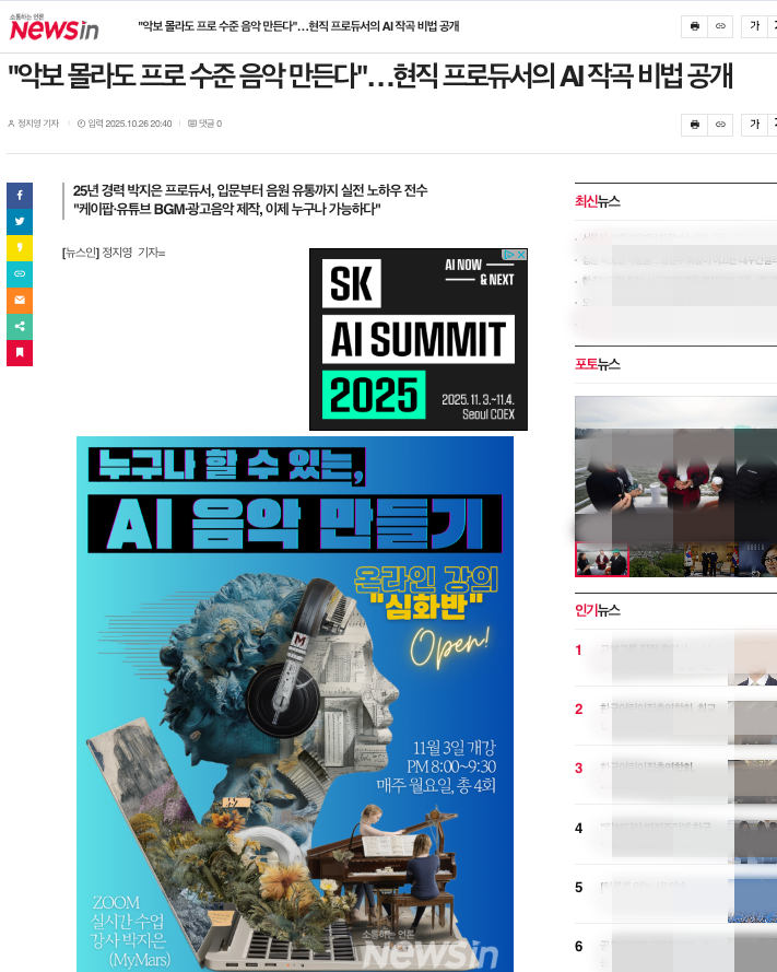 "악보 몰라도 프로 수준 음악 만든다"…현직 프로듀서의 AI 작곡 비법 공개 - 뉴스인