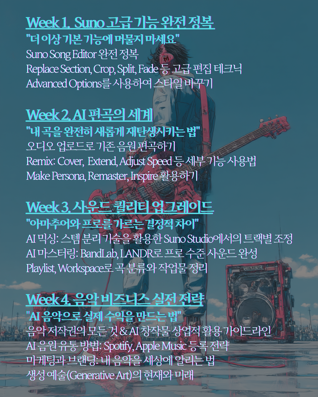 → Week 4 이후 당신은: AI 음악을 단순한 취미가 아닌, 실제 커리어로 확장할 수 있습니다!