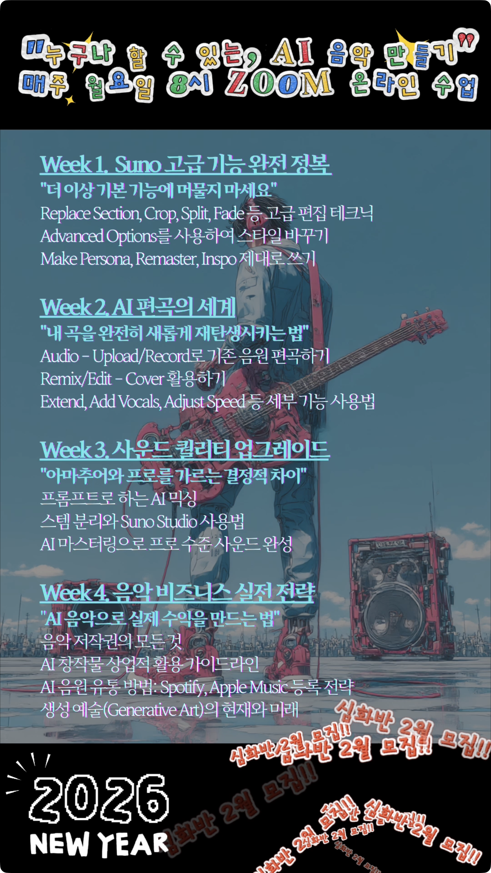 | [줌 온라인 강의] AI 작곡 입문반 - 2월반 모집 (0) | 2026.01.31 |