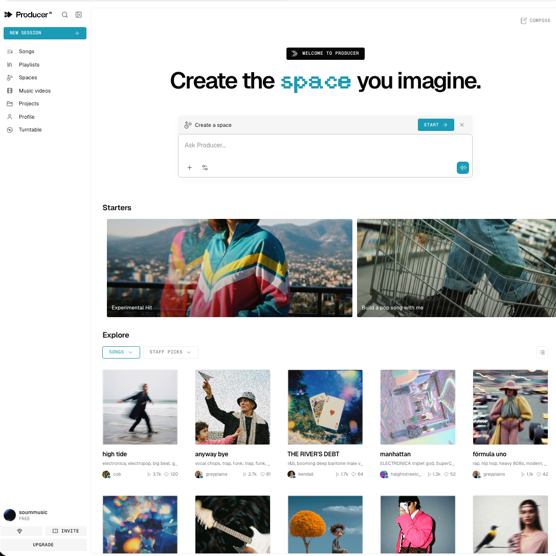 https://www.producer.ai/ AI 음악 생성 플랫폼 리퓨전(Riffusion)이 ‘프로듀서.ai(Producer.ai)’라는 새로운 이름으로 전면 개편됐다.이번 업데이트는 단순한 브랜드 변경이 아니라, 기술 구조와 제작 방식