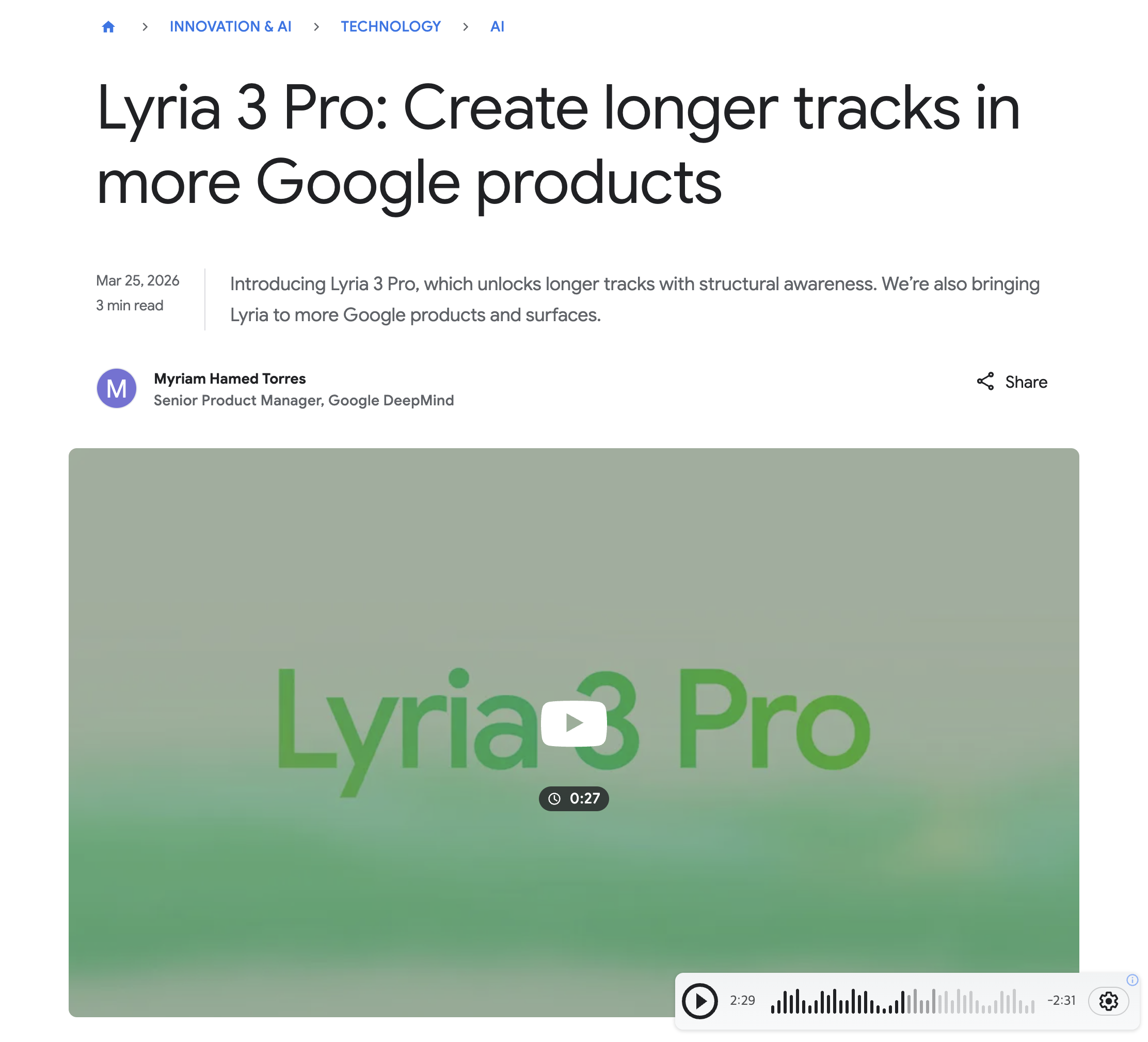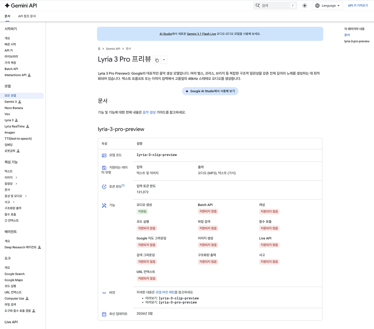 구글이 2026년 3월 25일 Lyria 3 Pro를 공개했다.