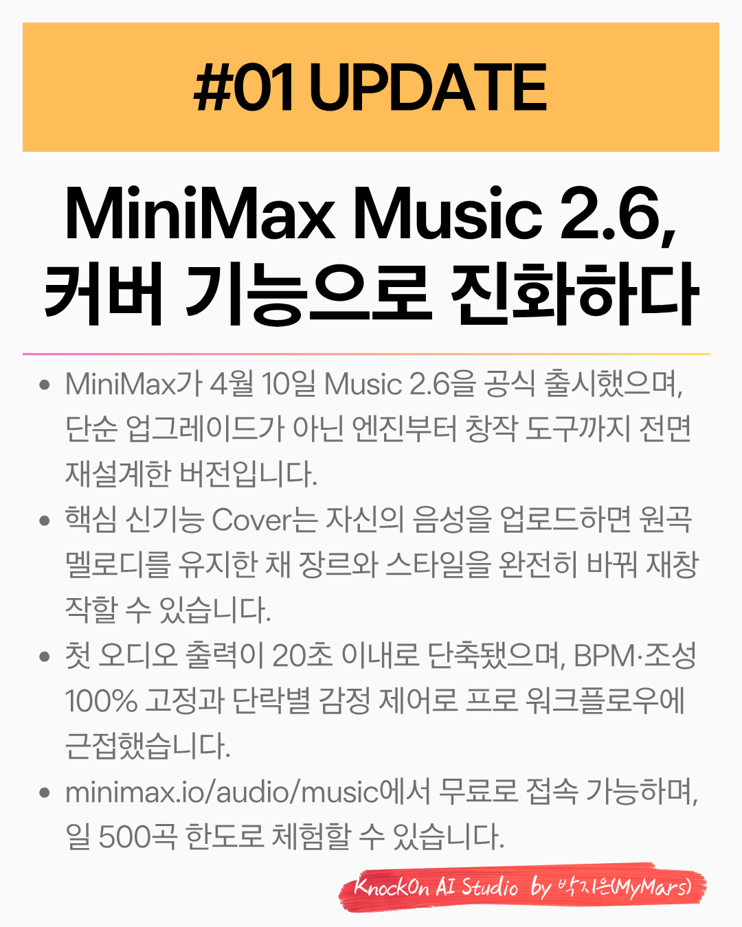 MiniMax가 커버 기능을 탑재한 Music 2.6을 출시했고, Udio는 Kobalt와 네 번째 라이선스 계약을 체결하며 제도권 진입을 가속화했습니다.
