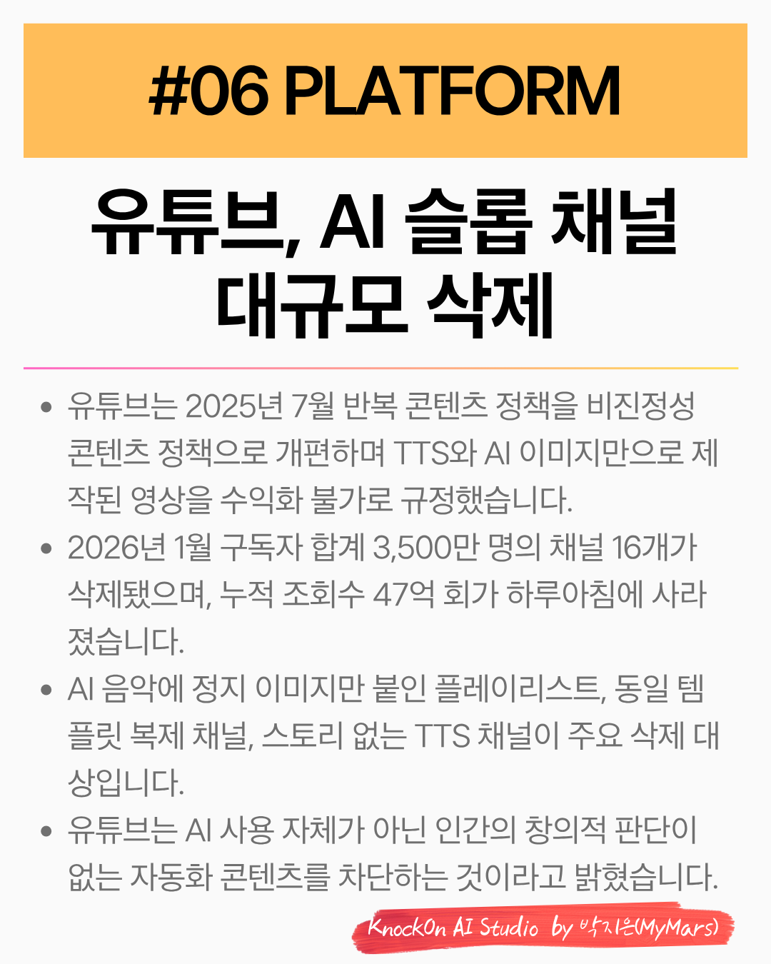 한편 유튜브는 TTS·AI 슬롭 채널을 대규모 삭제하며 콘텐츠 기준을 강화하고 있습니다.