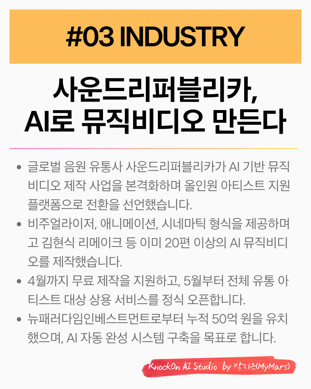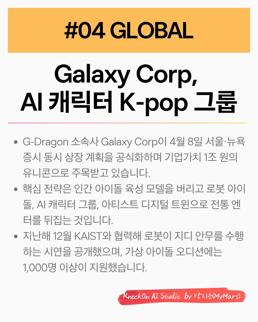 한국에서는 사운드리퍼블리카가 AI 뮤직비디오 제작 사업을 본격화했고, Galaxy Corp은 로봇 아이돌로 K-pop을 재정의하겠다며 서울·뉴욕 동시 상장을 선언했습니다.