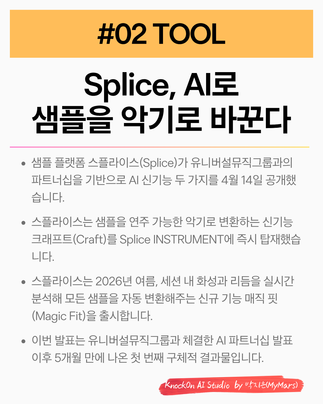ProducerAI가 Google Flow Music으로 새롭게 출범했고, Splice는 유니버설뮤직그룹과 손잡고 샘플을 악기로 바꾸는 AI 신기능을 공개했습니다.