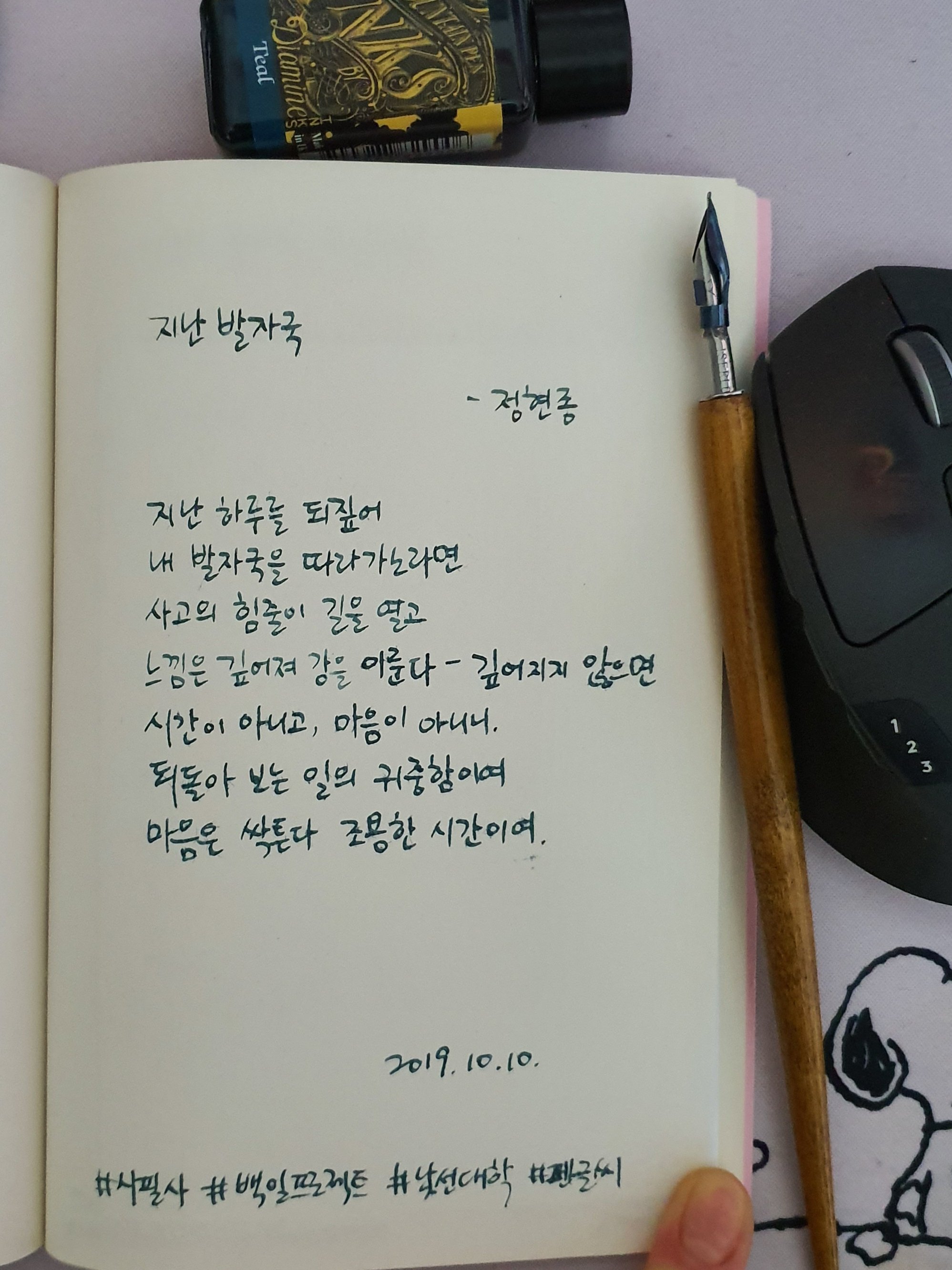 #지난발자국 #정현종 #시필사 #손글씨 #펜글씨 #닙펜 #딥펜 #백일프로젝트 #카카오프로젝트100 #낯선대학