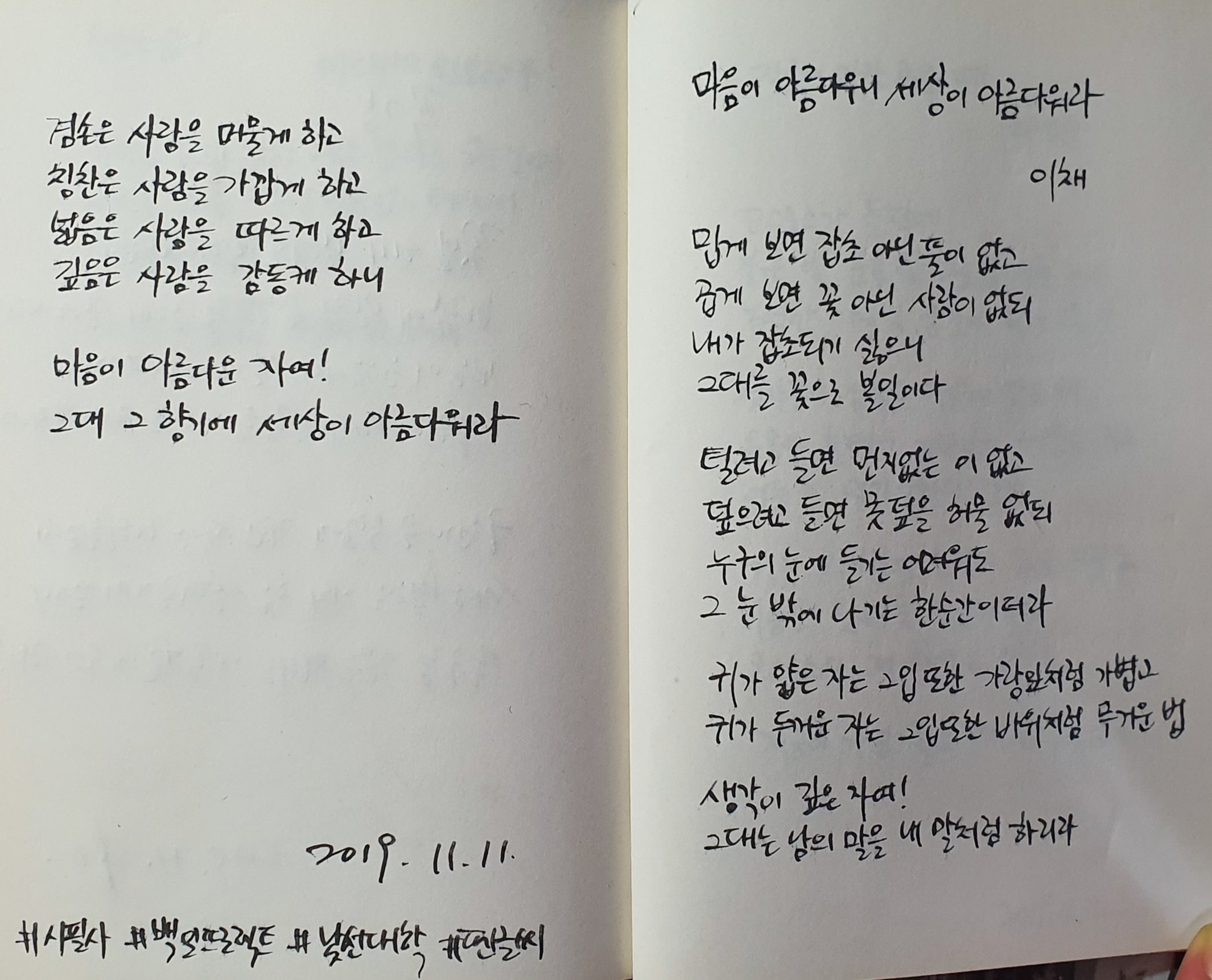 #마음이아름다우니세상이아름다워라 #이채 #시필사 #손글씨 #펜글씨 #닙펜 #딥펜 #백일프로젝트 #카카오프로젝트100 #낯선대학