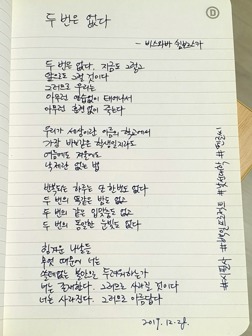 #두번은없다 #비스와바쉼보르스카 #시필사 #손글씨 #펜글씨 #100일 #백일프로젝트 #카카오프로젝트100 #낯선대학
