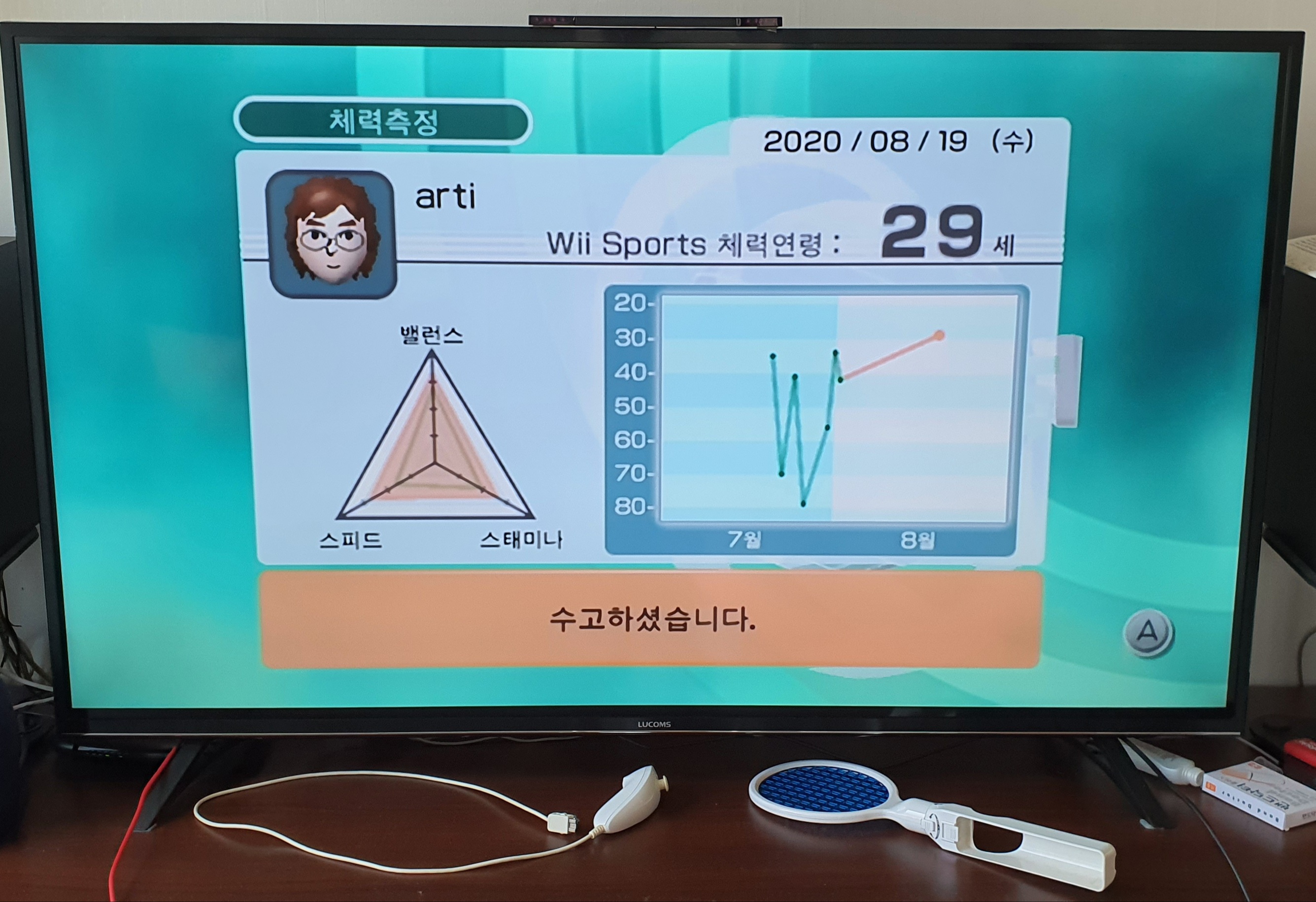 테니스도 금방 이기고, 체력 연령도 대박으로 나왔다.