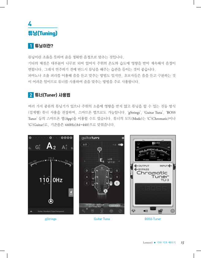 오늘의 과제는, 위의 동영상을 보시고 기타를 안고 자세를 잡은 후에 피크를 잡고 줄을 튕겨보고, 정확한 음으로 튜닝을 해보시는 겁니다.