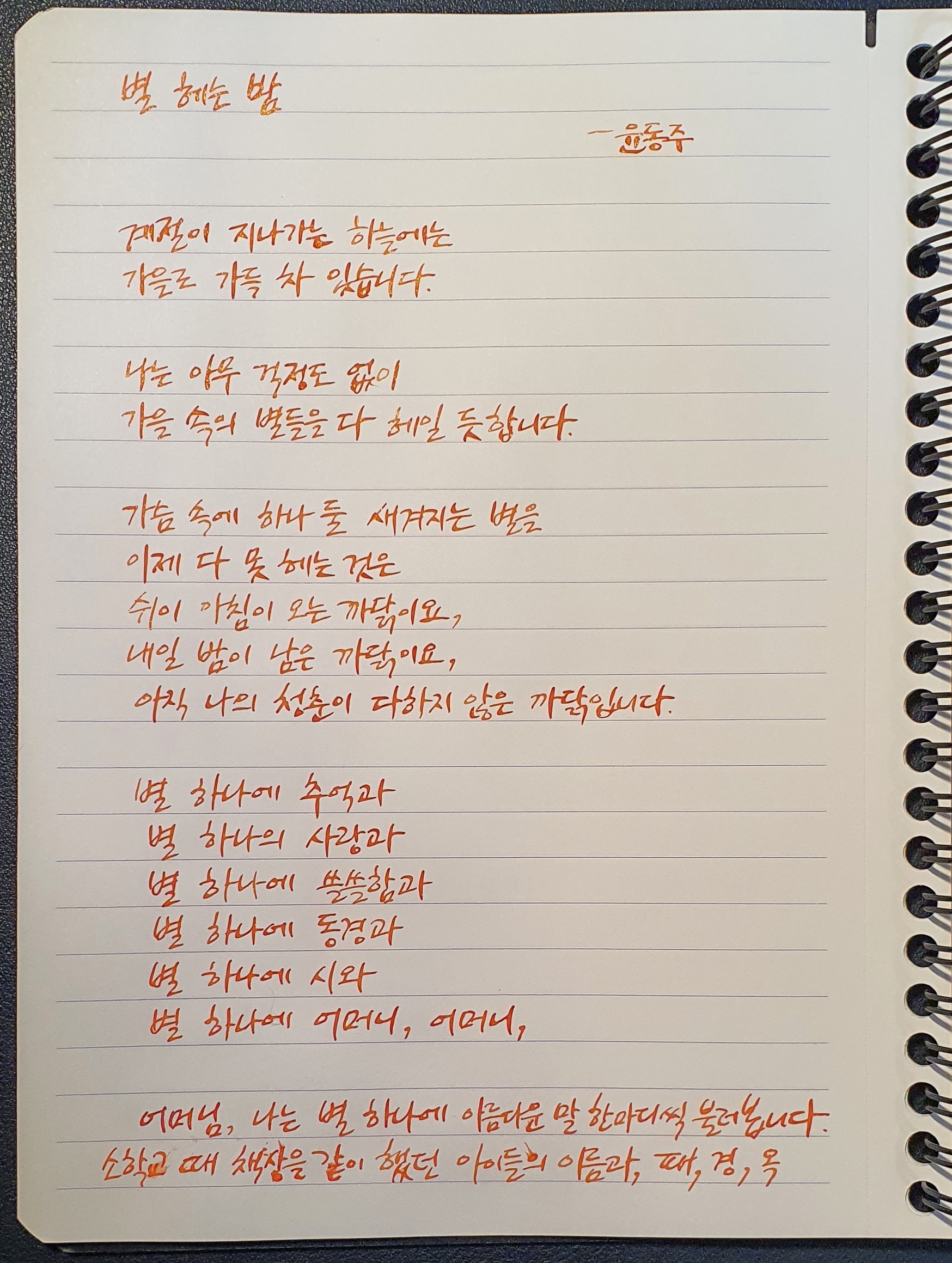 어머님, 나는 별 하나에 아름다운 말 한마디씩 불러 봅니다. 소학교 때 책상을 같이 했던 아이들의 이름과, 패, 경, 옥 이런 이국 소녀들의 이름과 벌써 애기 어머니 된 계집애들의 이름과, 가난한 이웃 사람들의 이름과, 비둘기, 강아지, 토끼, 노새, 노루, '프랑시스 잠', '라이너 마리아 릴케' 이런 시인의 이름을 불러 봅니다.