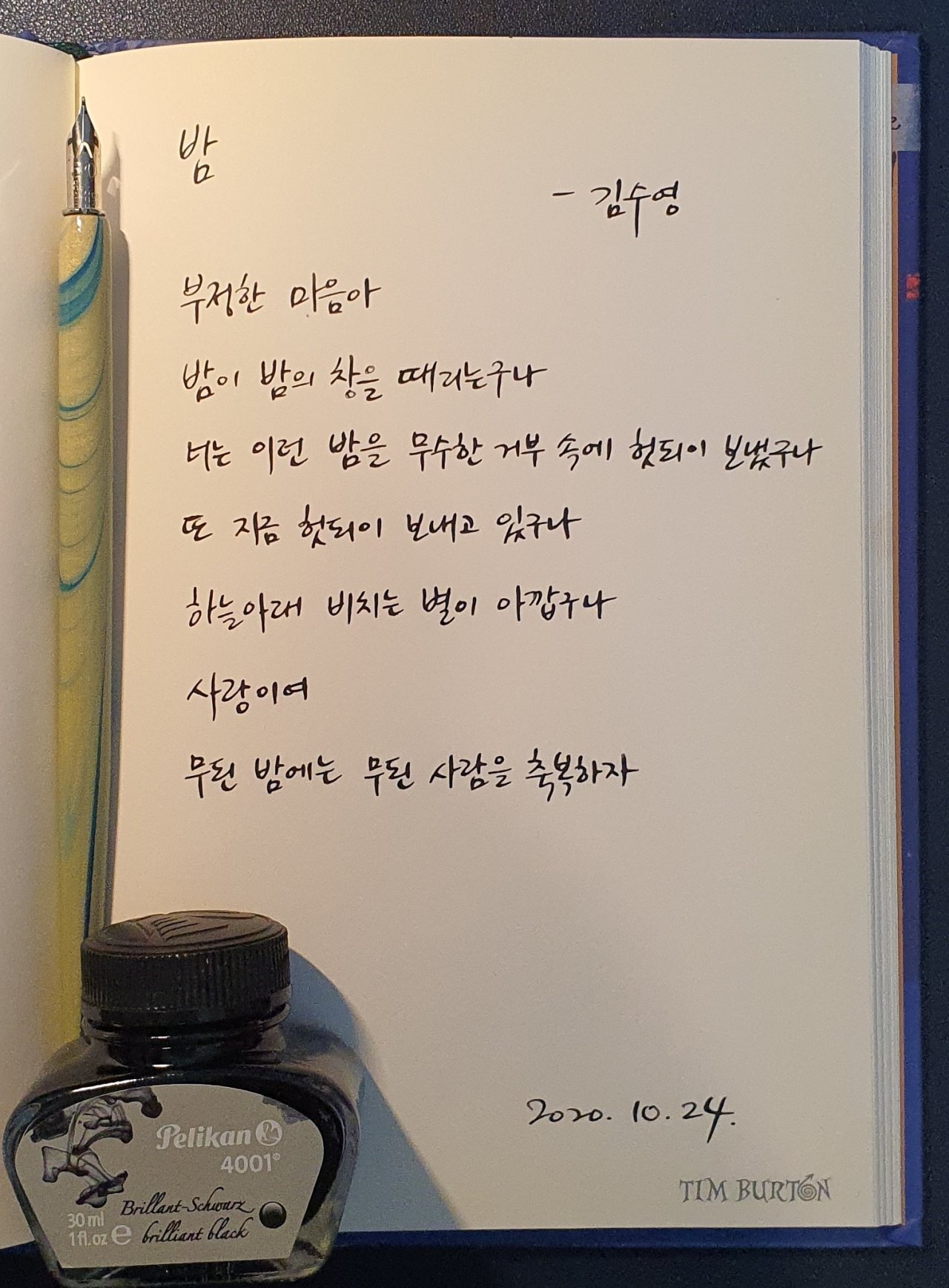 #밤 #김수영 #닙펜 #딥펜 #펜글씨 #손글씨 #매일프로젝트 #이른아침을먹던여름 #thatsummerwithyou #카카오프로젝트100 #낯선대학 #시처럼시필사