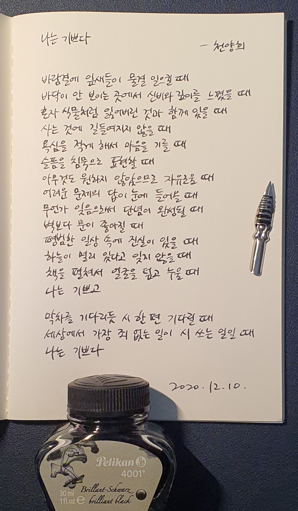 #나는기쁘다 #천양희 #닙펜 #딥펜 #펜글씨 #손글씨 #매일프로젝트 #이른아침을먹던여름 #thatsummerwithyou #카카오프로젝트100 #낯선대학 #시처럼시필사