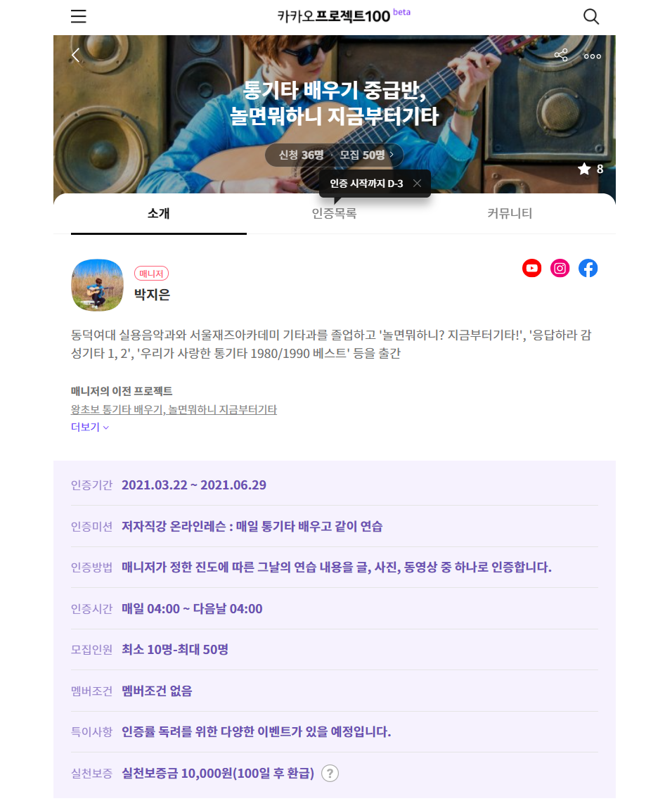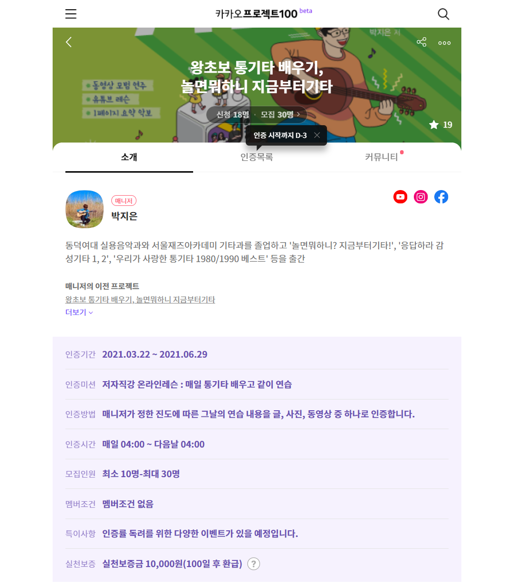 작년에 인기리에 진행된 카카오 프로젝트 100 <왕초보 통기타 배우기, 놀면뭐하니 지금부터기타>의 회원 모집이 3일 남았습니다.