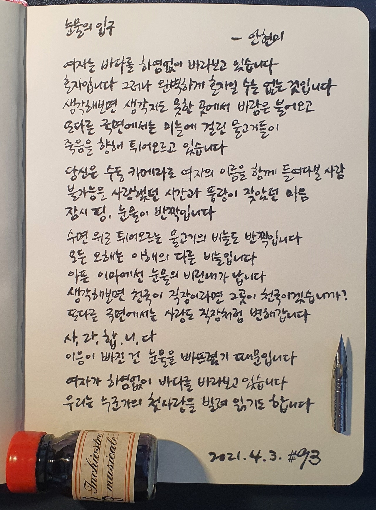 #눈물의입구 #안현미 #시필사 #닙펜 #딥펜 #펜글씨 #손글씨 #매일시쓰기 #1일1시 #하루에시한편 #이른아침을먹던여름 #thatsummerwithyou