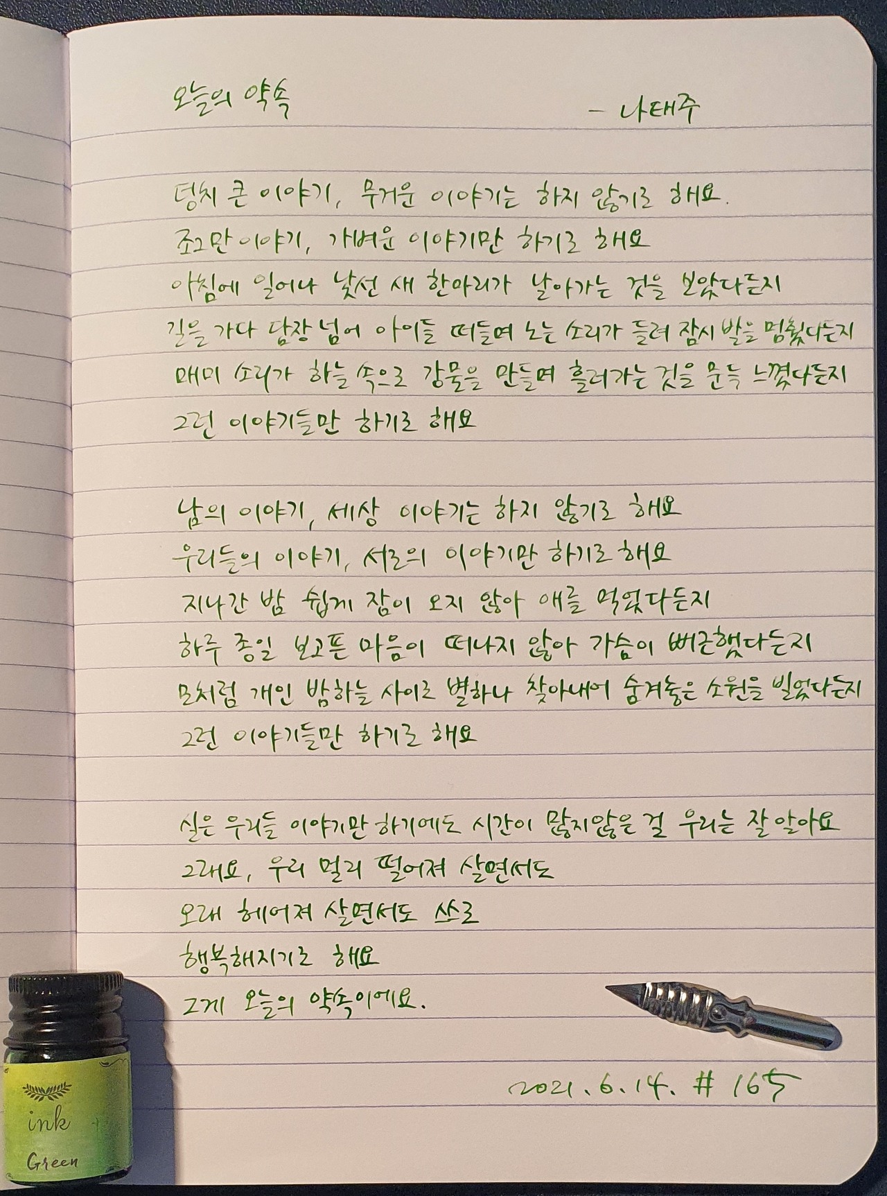 #오늘의약속 #나태주 #시필사 #닙펜 #딥펜 #펜글씨 #손글씨 #매일시쓰기 #1일1시 #하루에시한편 #이른아침을먹던여름 #thatsummerwithyou