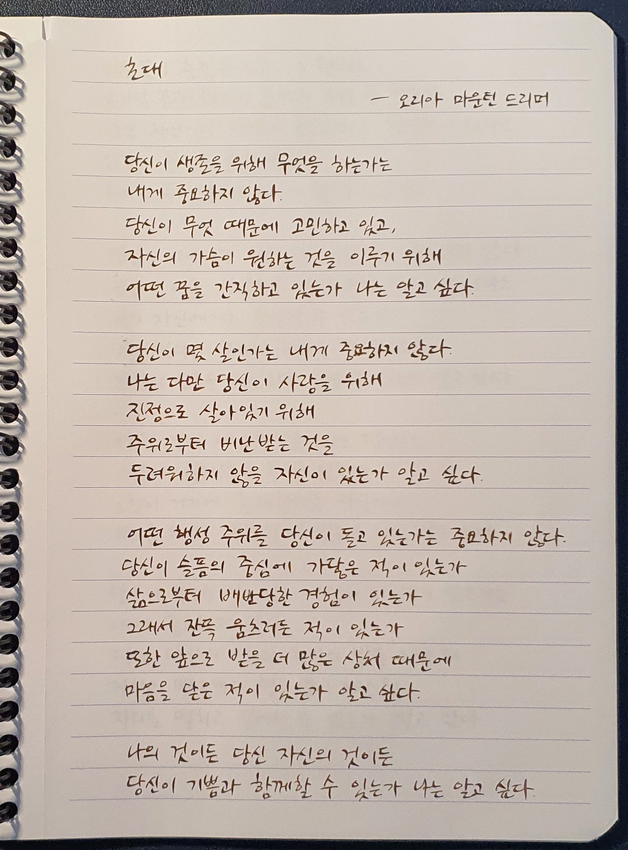 #초대 #오리아마운틴드리머 #시필사 #닙펜 #딥펜 #펜글씨 #손글씨 #매일시쓰기 #1일1시 #하루에시한편 #이른아침을먹던여름 #thatsummerwithyou